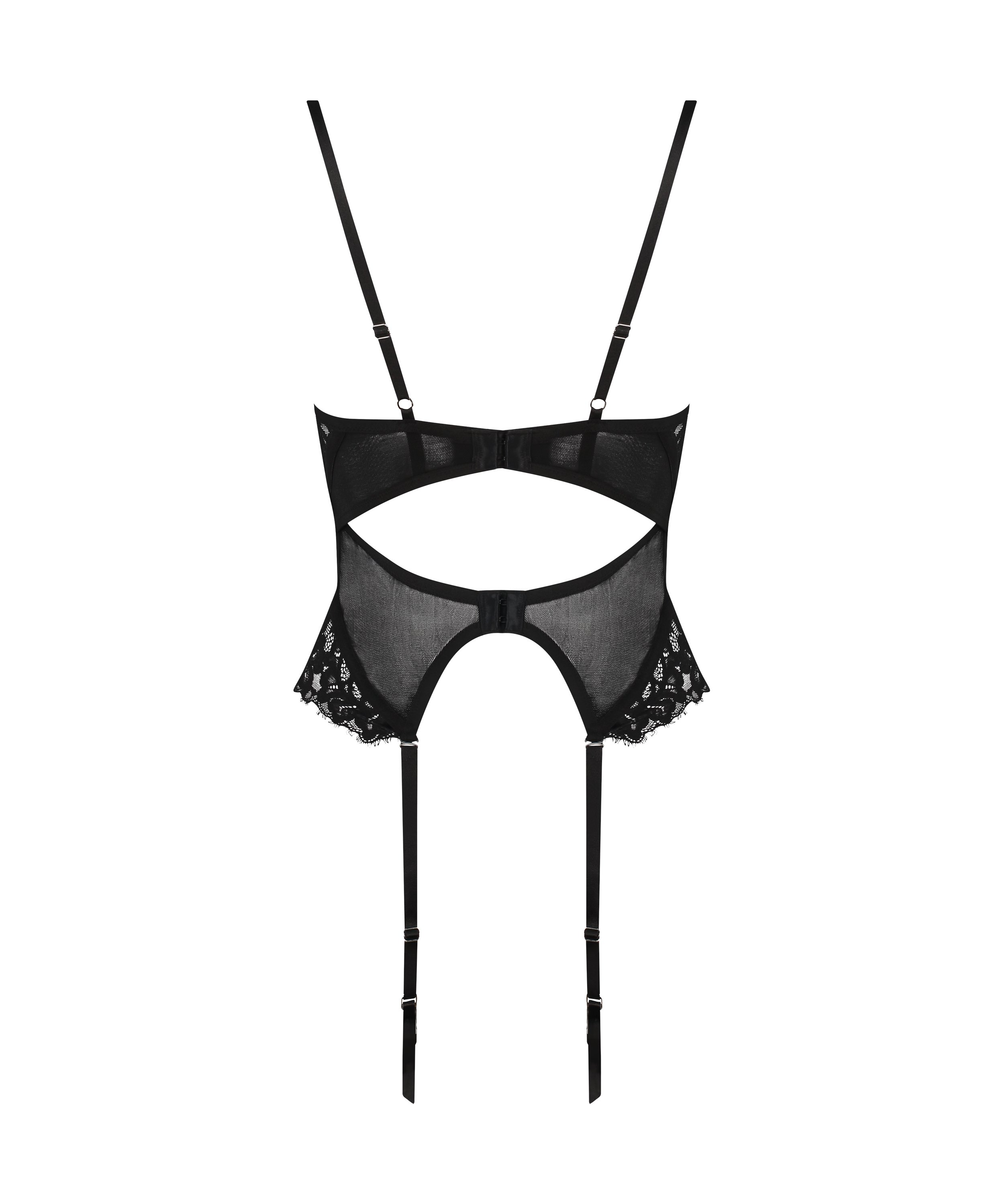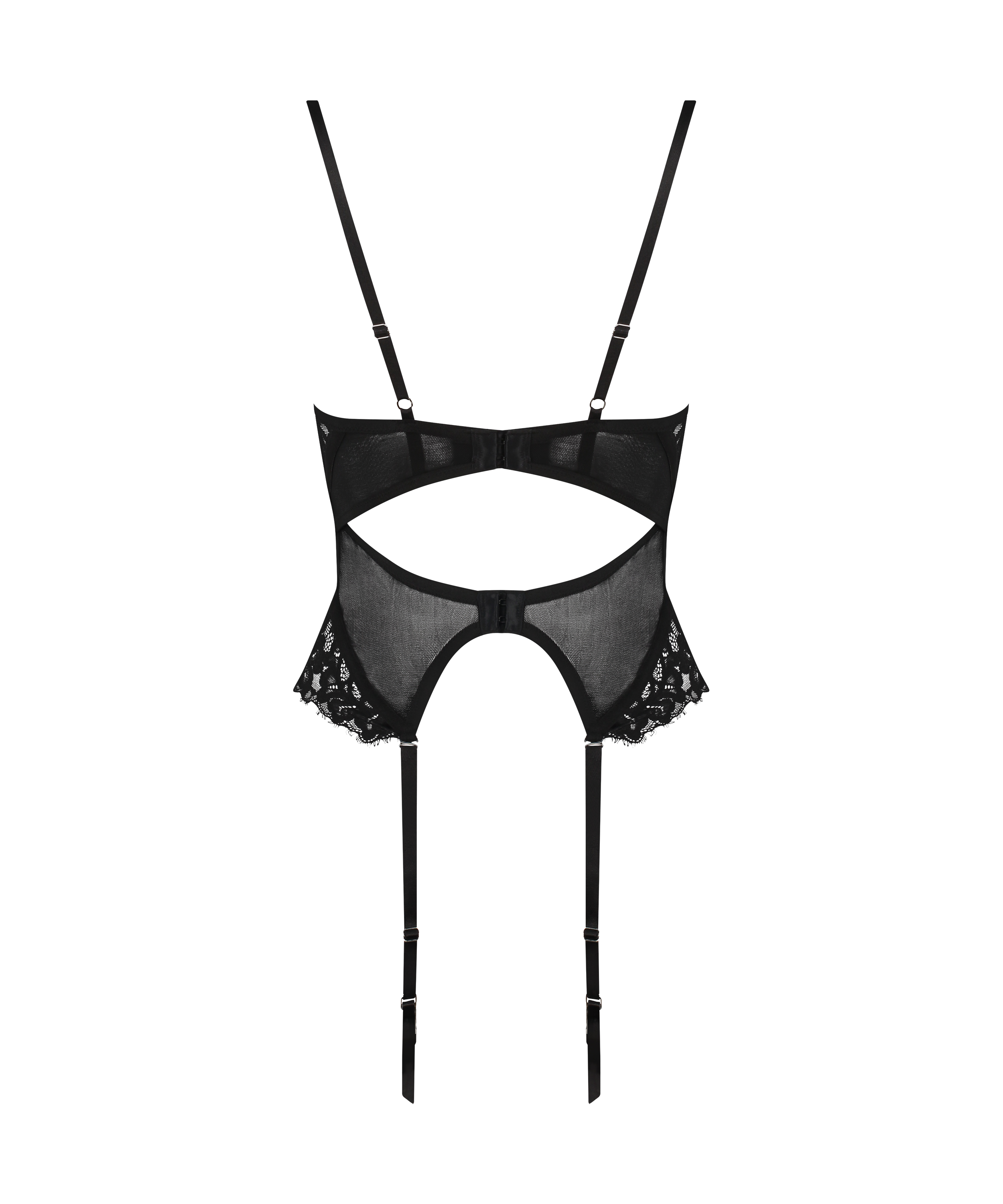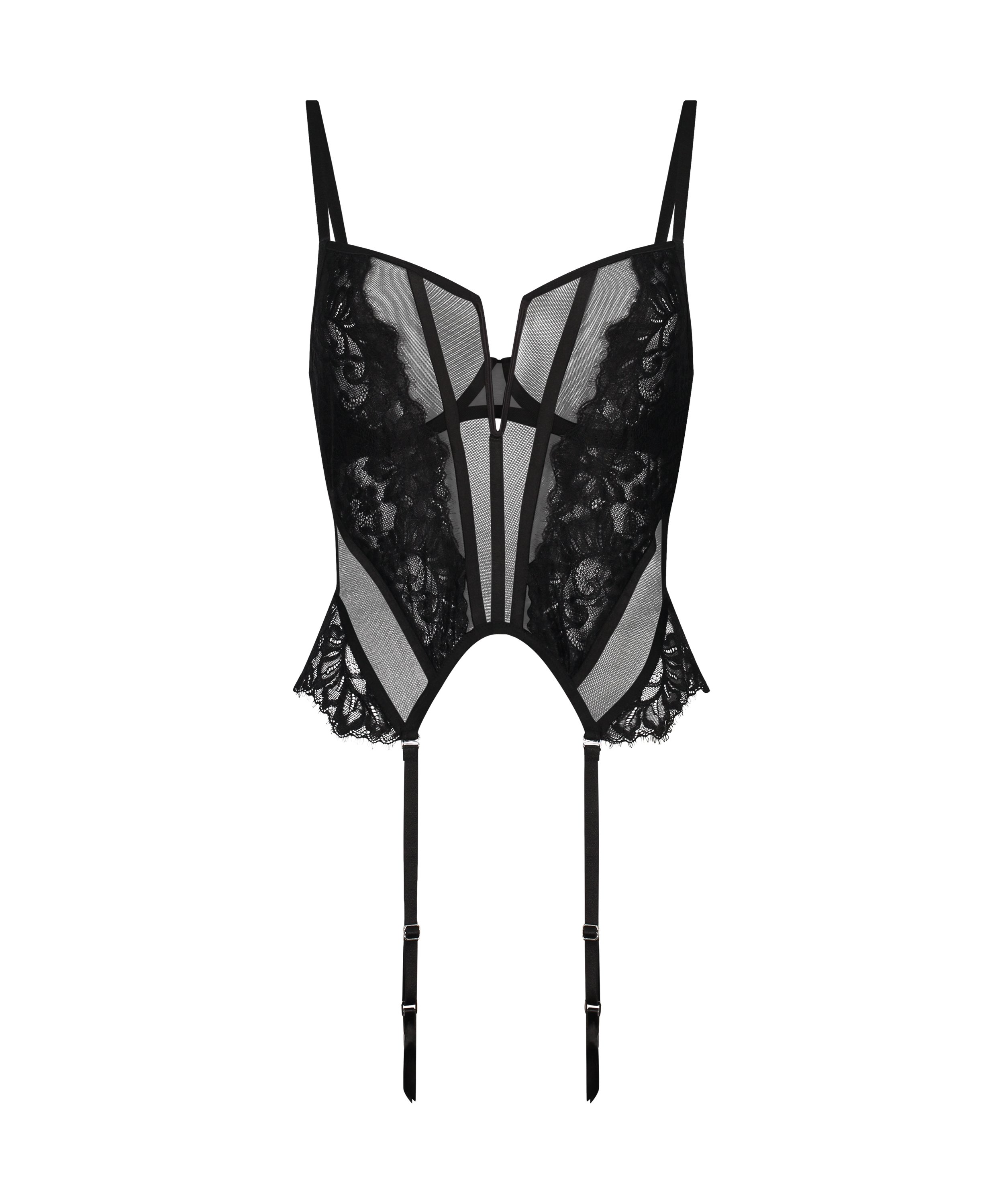 Revamp your lingerie collection with our alluring lace bustier! This statement piece features delicate lace details and sultry mesh cut-outs for a captivating look. It offers a customized fit with the adjustable straps and a touch of playful elegance with the removable suspender straps. Pair it with matching lingerie and hosiery for a complete ensemble!