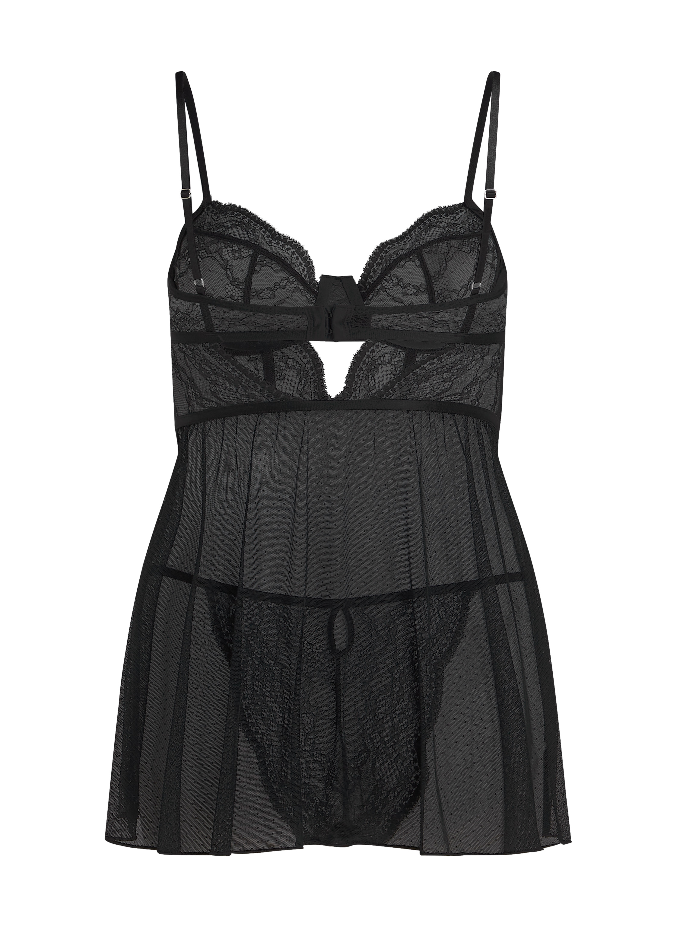 Feel sexy in this gorgeous baby doll! With a romantic all-over lace look and frontal and back boning for the best support, along with underwired cups. We can't forget about the matching brasilian in the set!