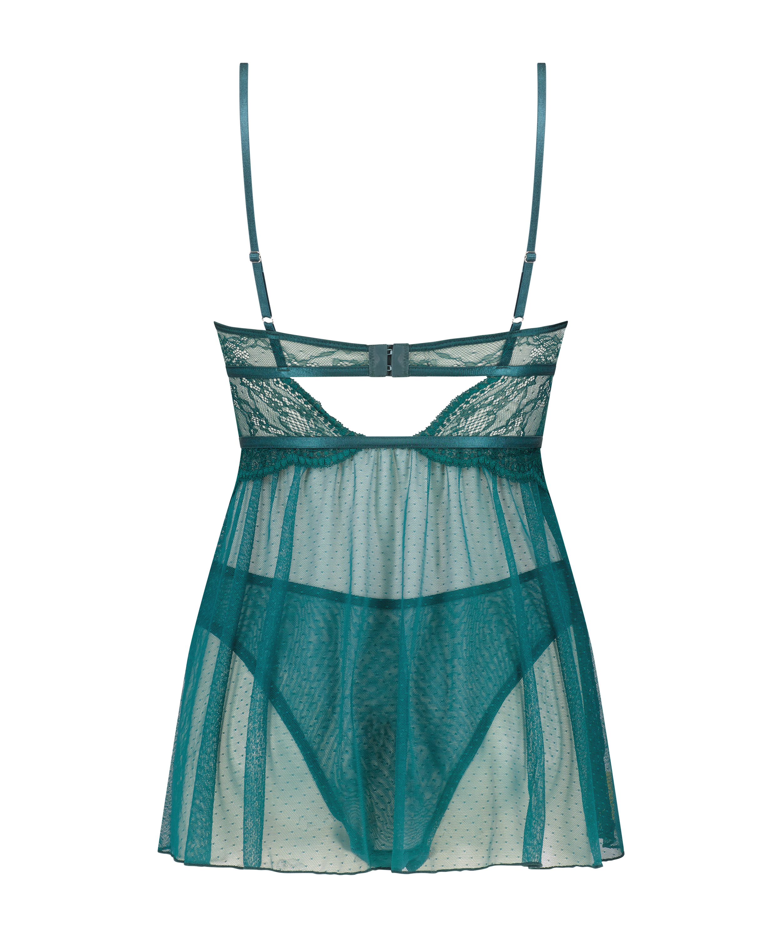 Feel sexy in this gorgeous baby doll! With a romantic all-over lace look and frontal and back boning for the best support, along with underwired cups. We can't forget about the matching brasilian in the set!