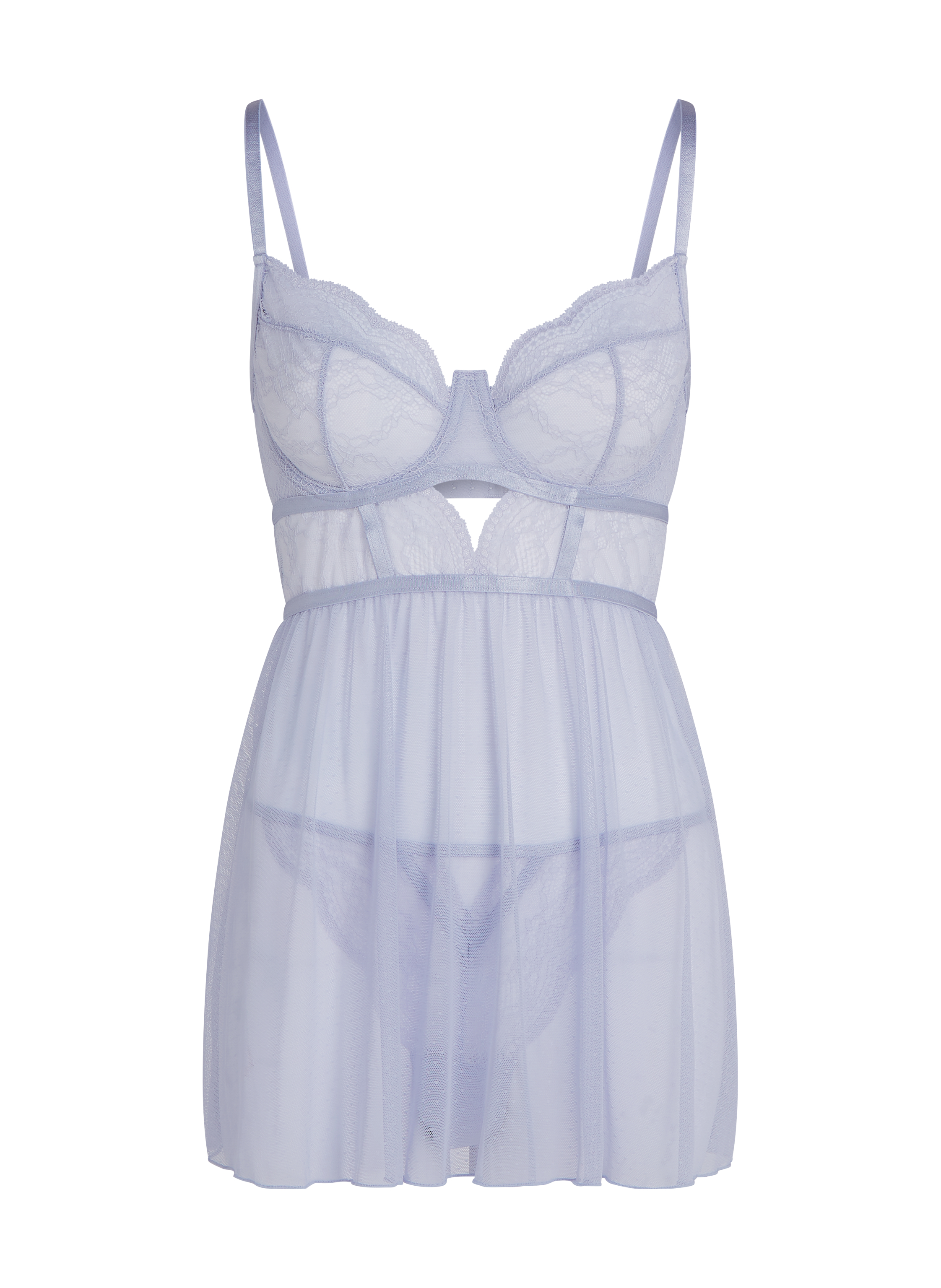 Feel sexy in this gorgeous baby doll! With a romantic all-over lace look and frontal and back boning for the best support, along with underwired cups. We can't forget about the matching brasilian in the set!
