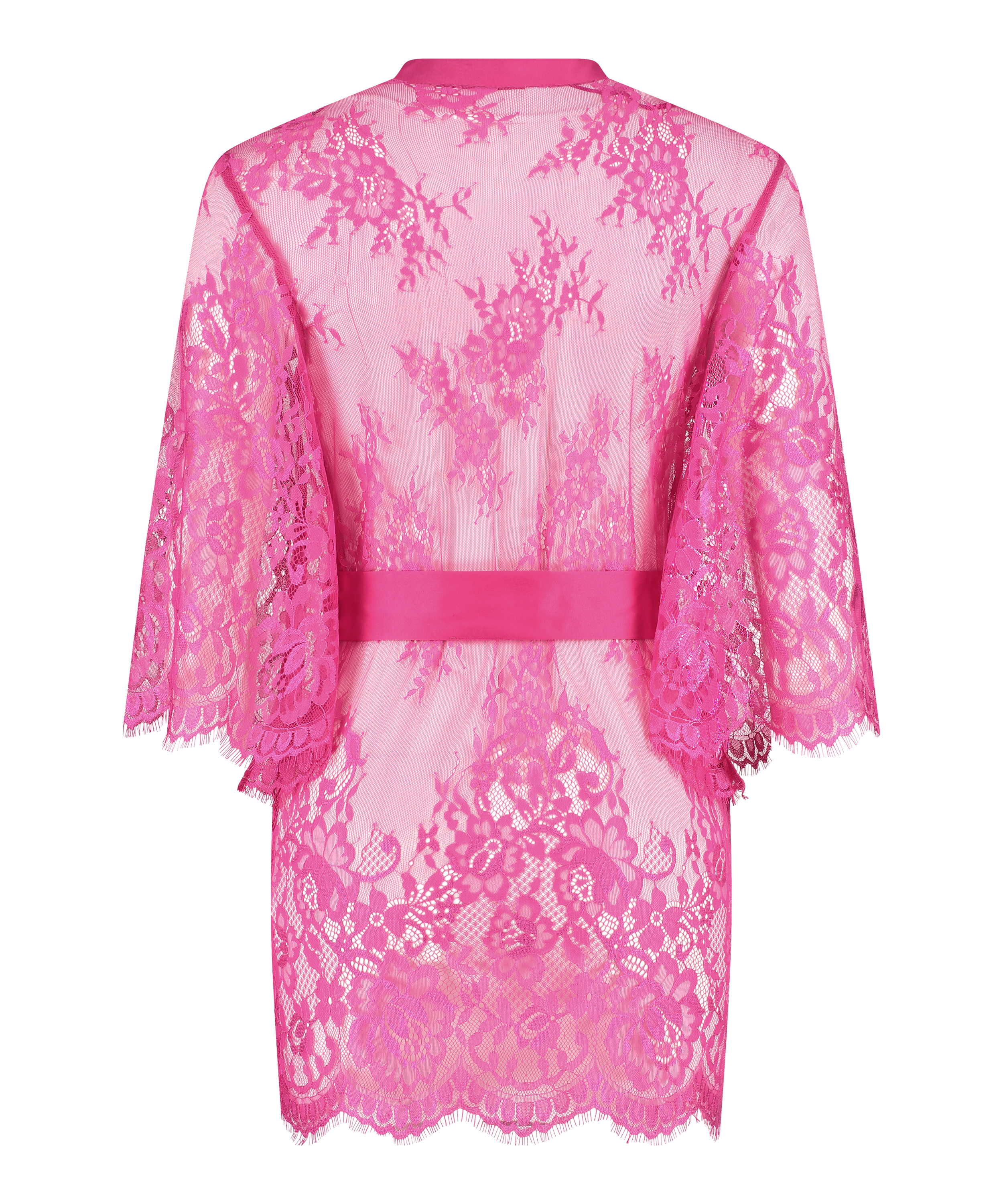 This kimono has it all: sexy, feminine and lots of lace. It is made from transparent lace with satin details and has a button-up front.