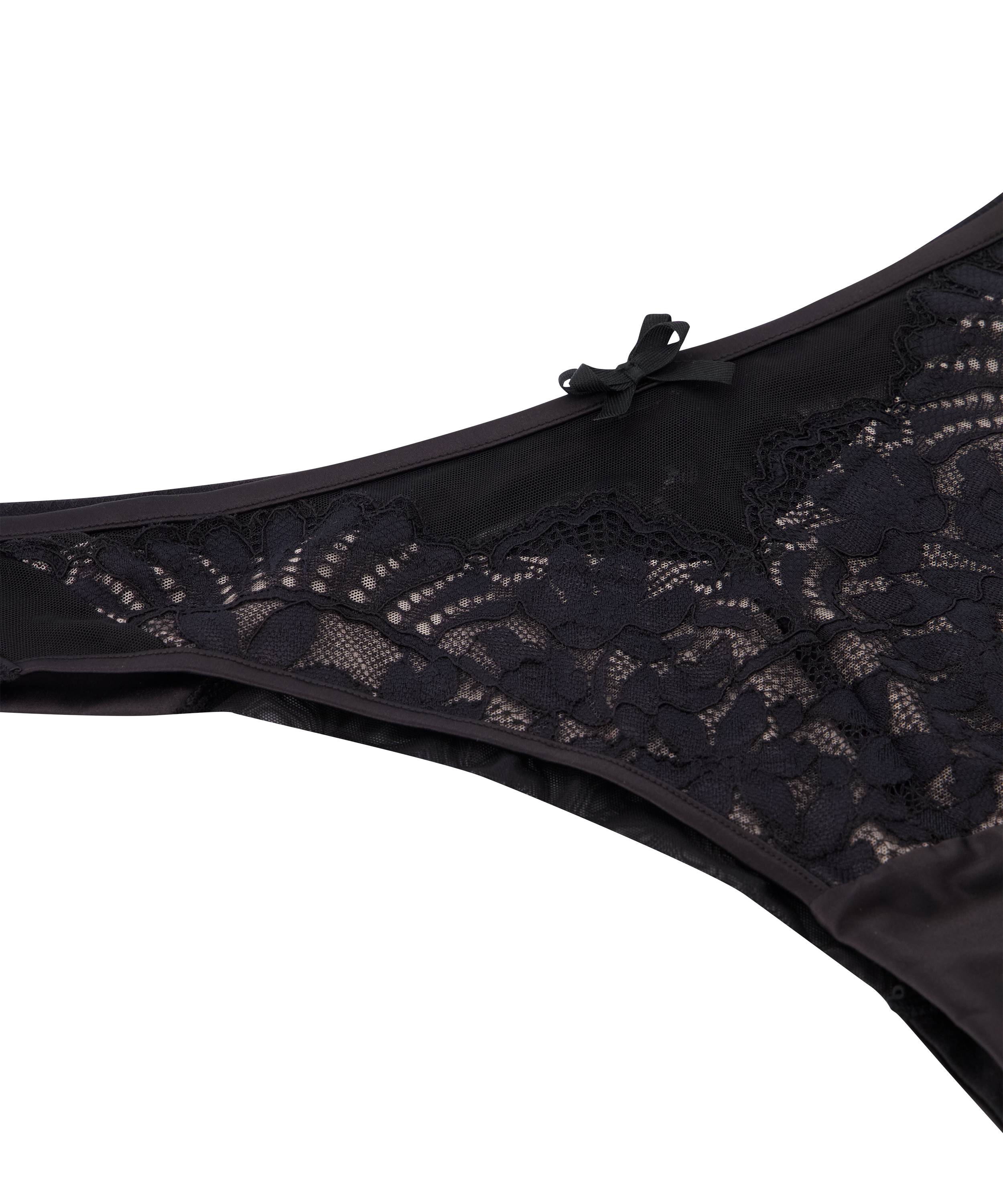 Treat yourself with our must-have Jamie lingerie set! Give your basics the day off with this stunning brazilian. Made with gorgeous mesh and lace fabrics, a cute bow on the front and a daring lace design on the back. Match with the Jamie set items for a complete look! Part of the Noir collection.