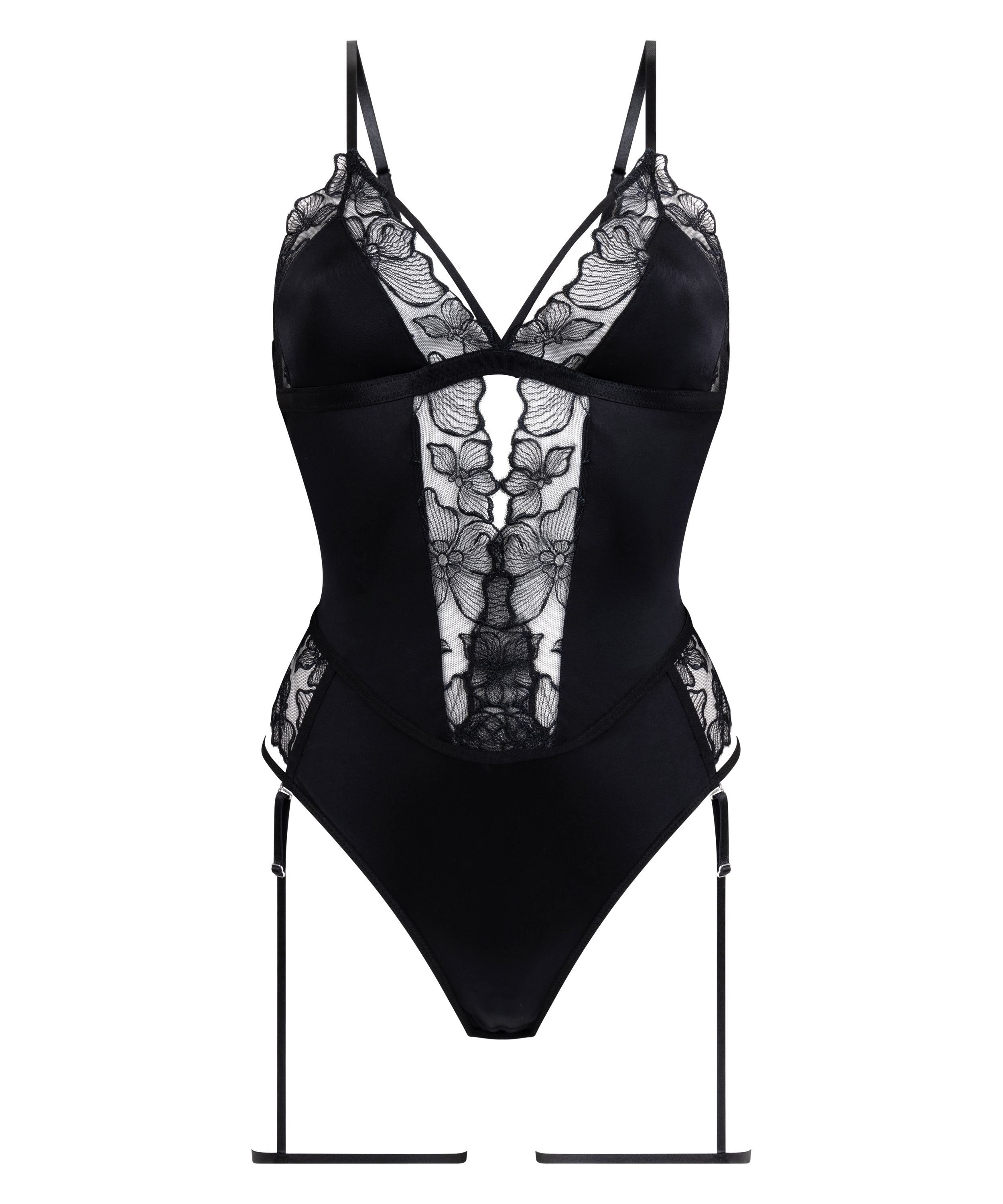 Turn up the allure with our body, a bold and sophisticated piece designed to make a statement. Combining delicate lace and silky satin, this body offers a luxurious feel and a captivating look. A cut-out detail in the front adds a nice touch. The removable garter belt provides versatile styling options, allowing you to customize your look effortlessly.