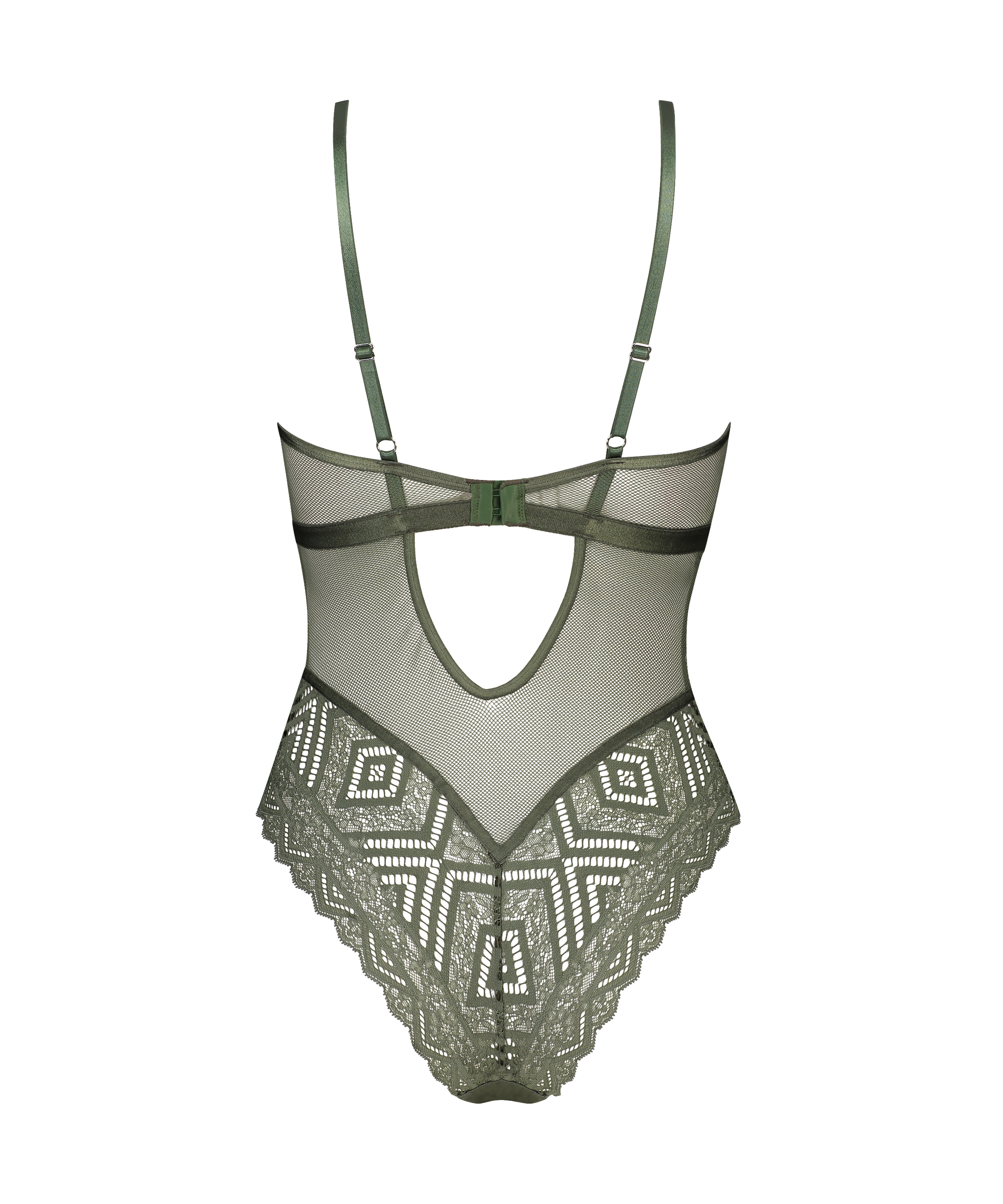 Feel romantic in this body! It is made almost entirely of lace and mesh. Its plunge V-neck adds a sexy touch. Combine with a matching kimono from our collection for a complete set! Part of the I AM Danielle collection.