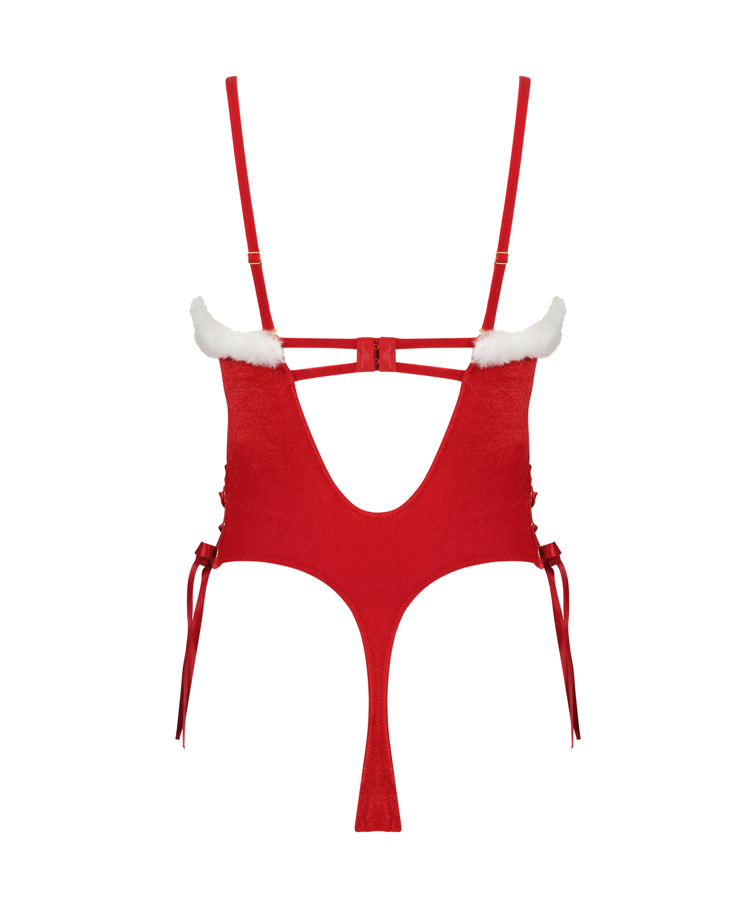 Time to get festive with this amazing holiday body! With a soft velvet feel all-over, and of course faux fur lining the edges. Cute bows are added on each side. Show off your holiday spirit!
