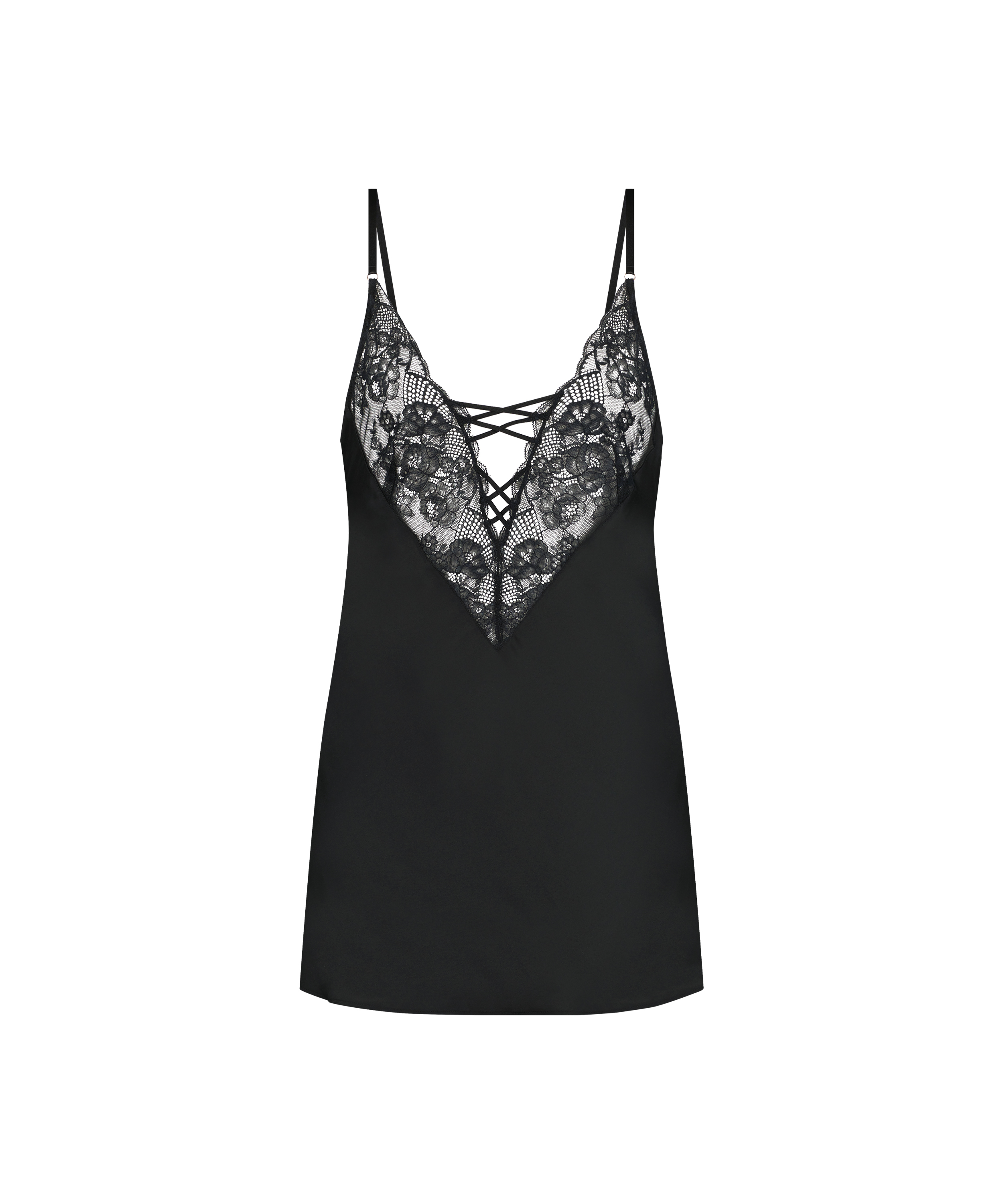 Look stunning in this slip dress! With a satin look and feel, decorated with floral lace and strappy details. Match with a kimono!
