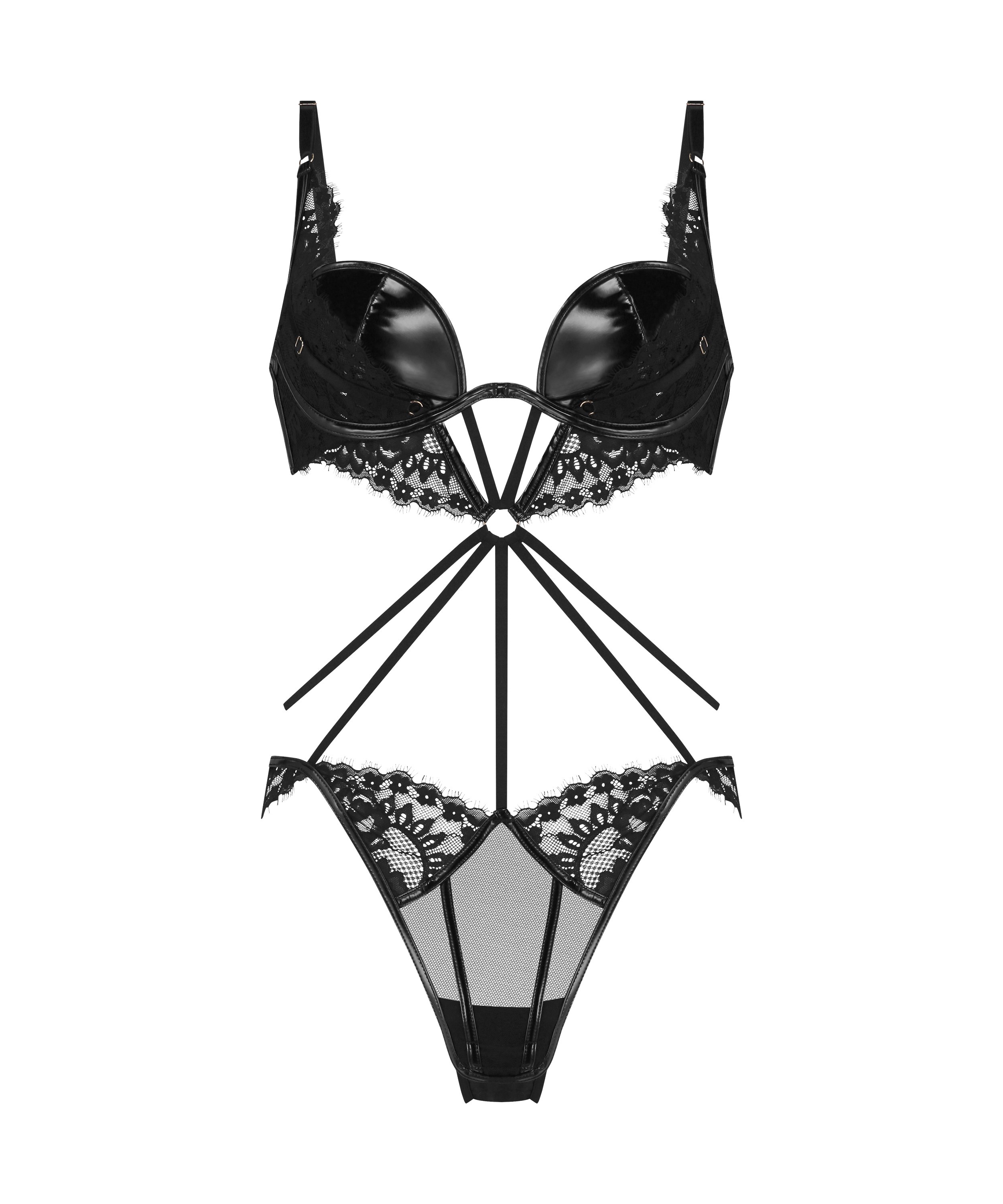 Make a lasting impression when wearing this daring and revealing body! The Kali body features lace detailing and directional strapping. The beautiful design of the cups ensure the final look is nothing short of unforgettable, with a gentle wired support. Together with a stud-closure on the bottom, open back and provocative cut-out back brief, this is a standout piece. Part of our Private collection.