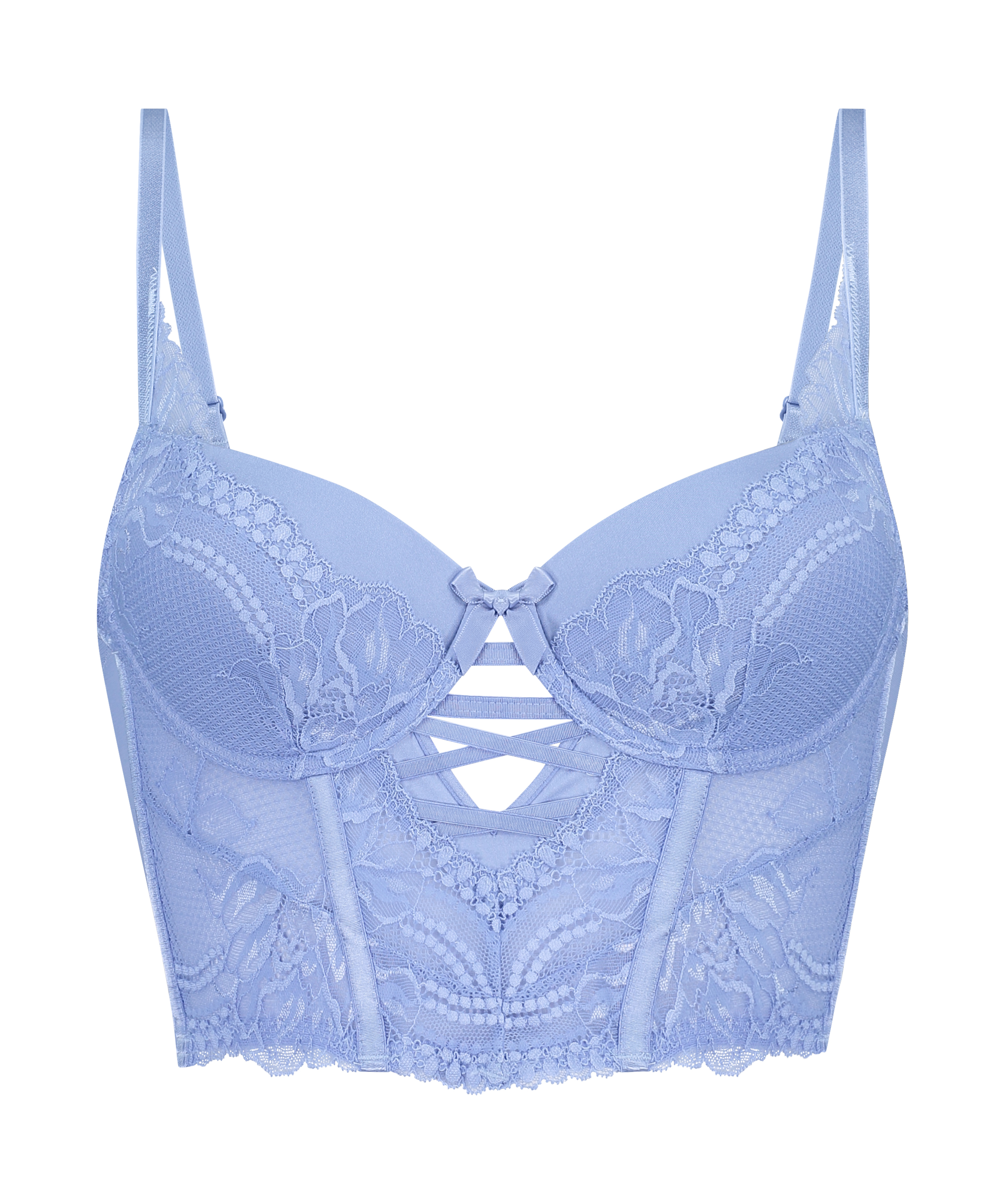 Feel sexy in this padded bra! With lace details all over the cups and longline skirt. The skirt is semi-transparent with boning for the best look. Underneath the cups there are strappy and cut out details. Find the matching knickers for the complete set!