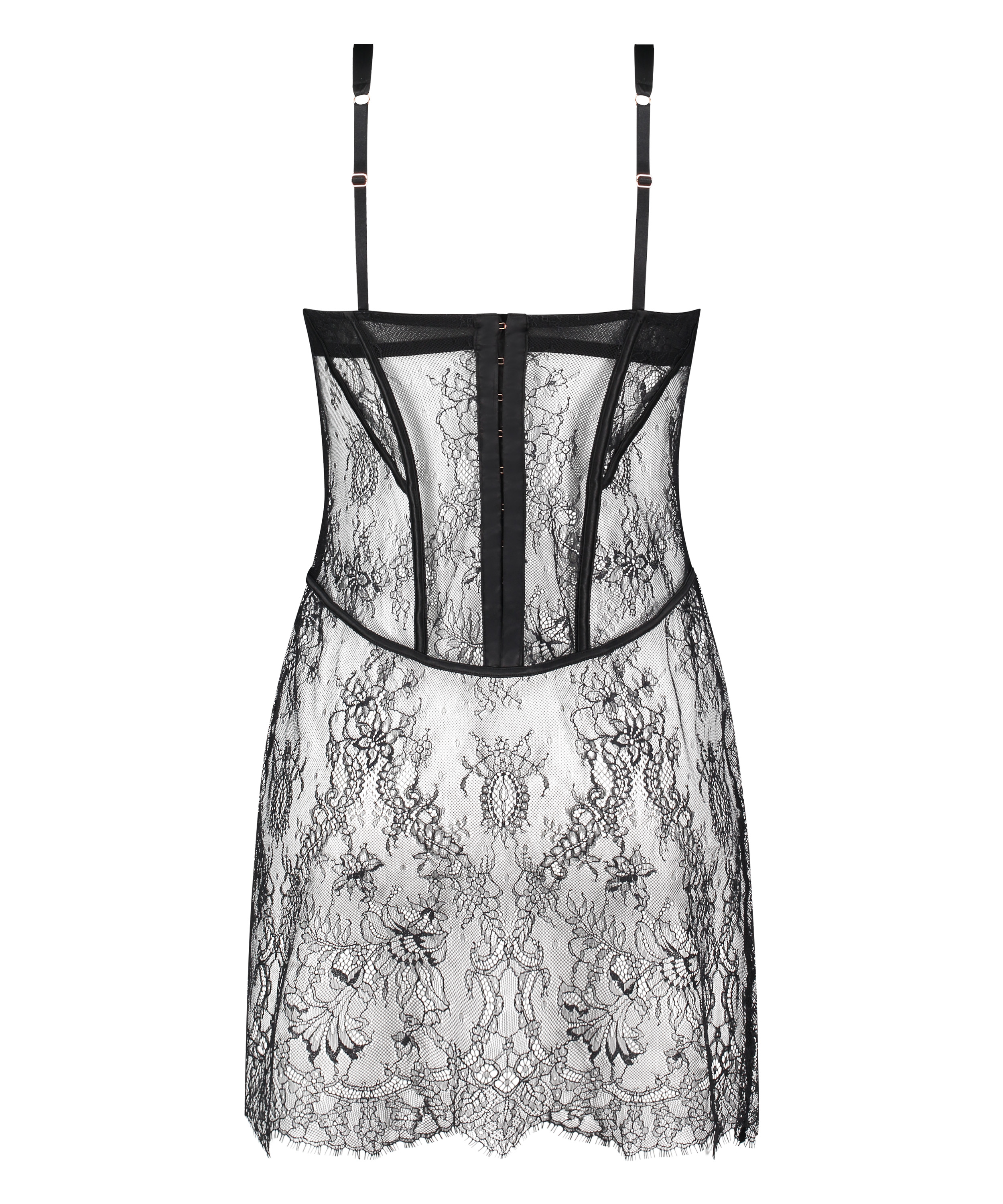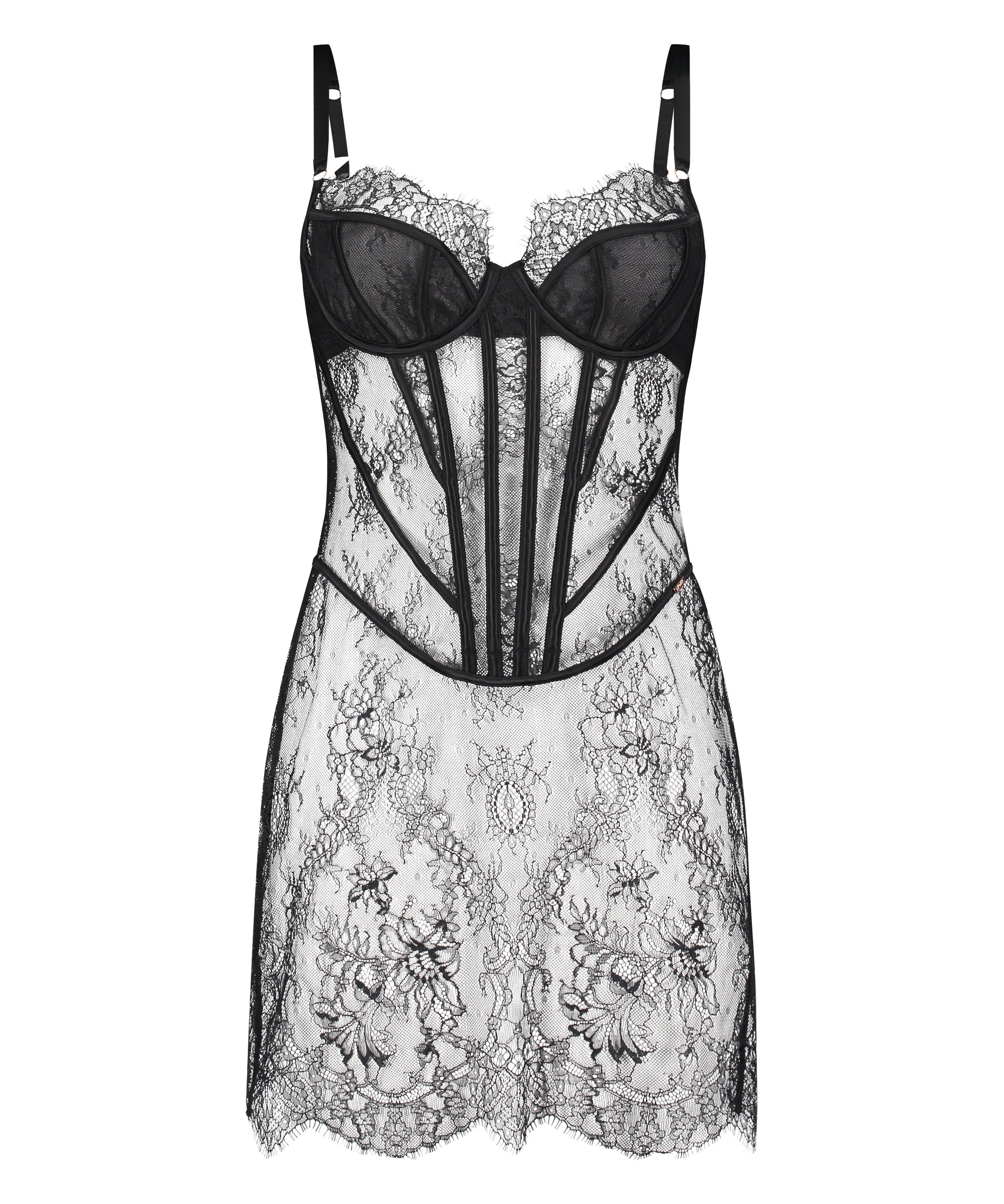 If you want to feel sexy in a slip dress, this is the one! This slip dress will fully cover you in delicate floral lace and give the illusion of a sculpted silhouette due to the beautiful boning design in the front and the back. The non-padded, double-layered, lace finished cups create a partially sheer and alluring effect, while the underwire provides ideal support. For added convenience, the bra features nine hook-and-eye closures for secure fastening in the back, complemented by adjustable satin straps for a custom fit. This dress is part of our Noir collection and can be combined with a matching thong!
