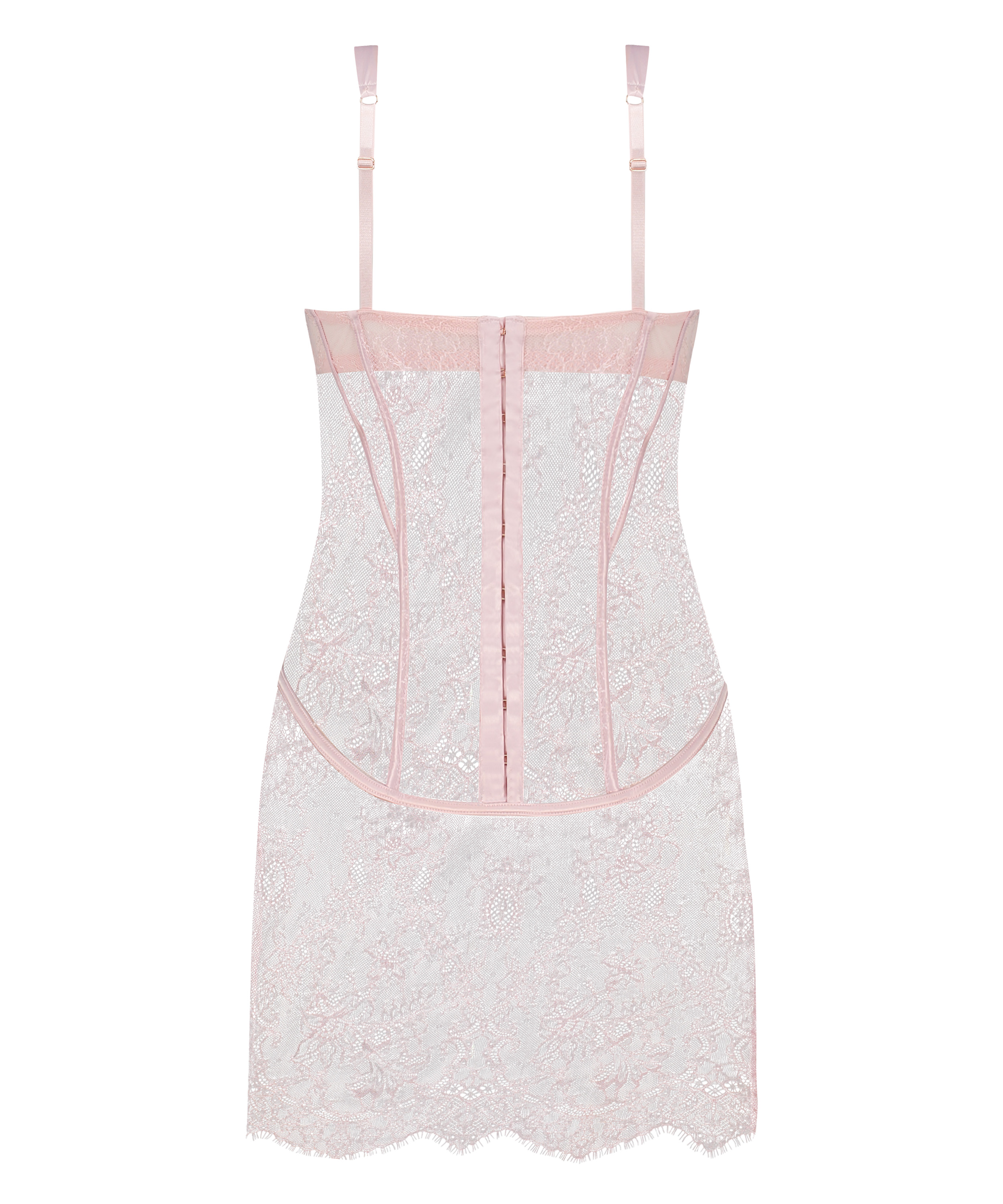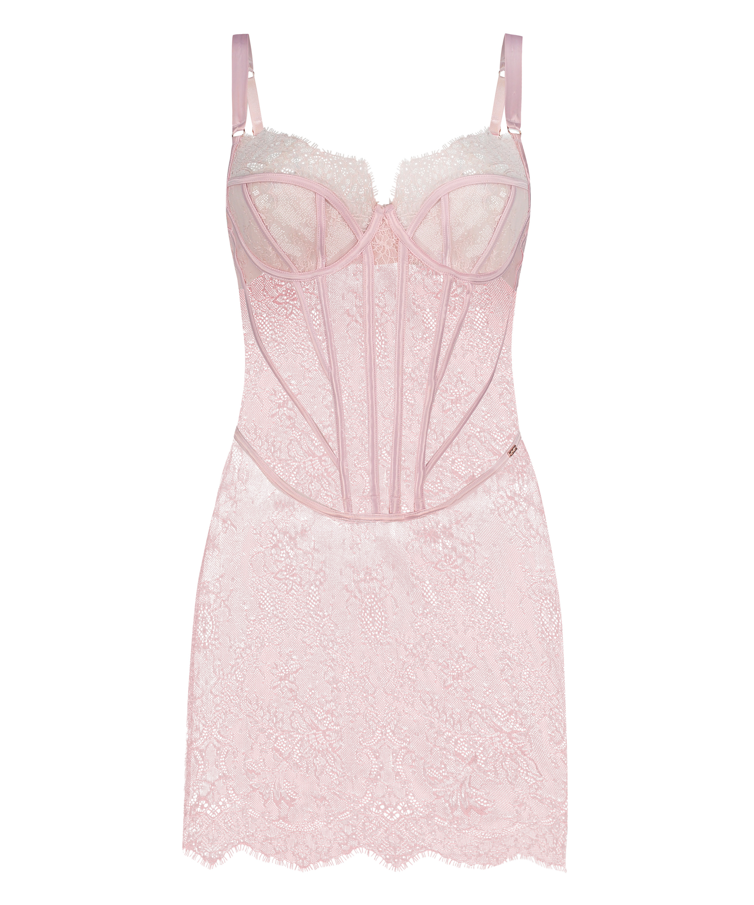 If you want to feel sexy in a slip dress, this is the one! This slip dress will fully cover you in delicate floral lace and give the illusion of a sculpted silhouette due to the beautiful boning design in the front and the back. The non-padded, double-layered, lace finished cups create a partially sheer and alluring effect, while the underwire provides ideal support. For added convenience, the bra features nine hook-and-eye closures for secure fastening in the back, complemented by adjustable satin straps for a custom fit. This dress is part of our Noir collection and can be combined with a matching thong!