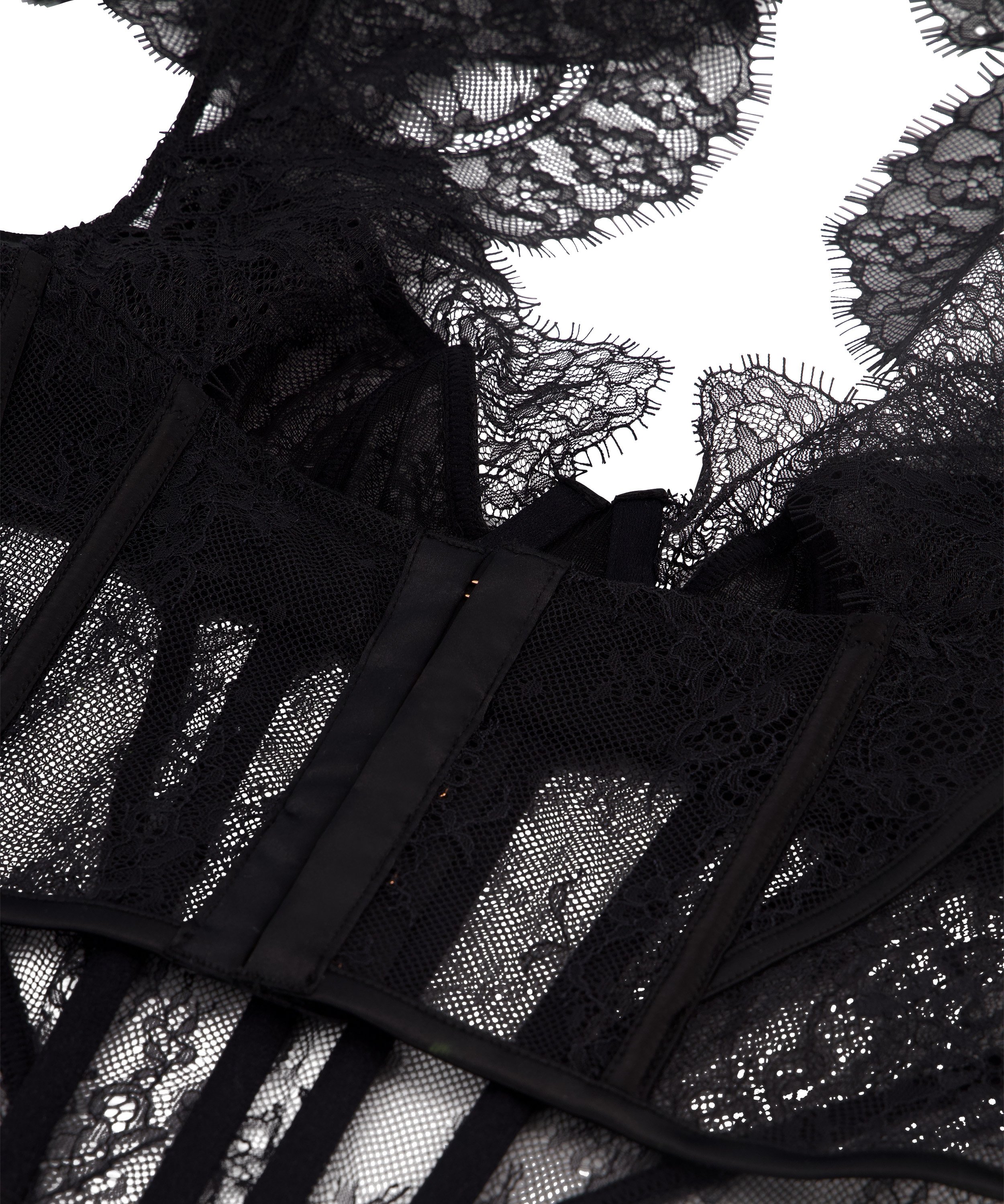 Channel your inner Goddess in this exquisite top! Crafted from delicate floral lace, it has boning in the front and back for a sculpted silhouette. The non-padded double-layered cups offer a semi-transparent allure, while the underwires ensure optimal support. For added convenience, the bra can be secured with five hook-and-eye closures. Finished with a lace-trimmed turtle-neck and short sleeves with button closure, it exudes elegance from every angle. It is part of our Noir collection. Complete the look by pairing it with our Camille French Lace Knicker for a truly captivating ensemble!