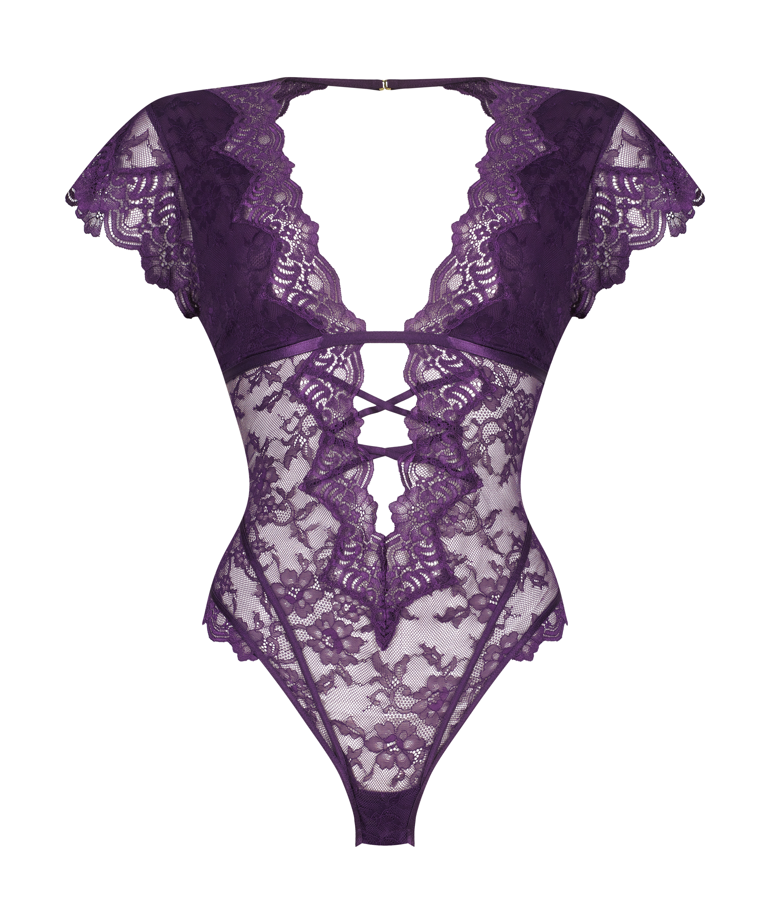 Feel sexy in this body! It has a lace look all-over with intricate front details. It is a thong with a clamp on the crotch for ease. Check out the kimonos to complete the look!