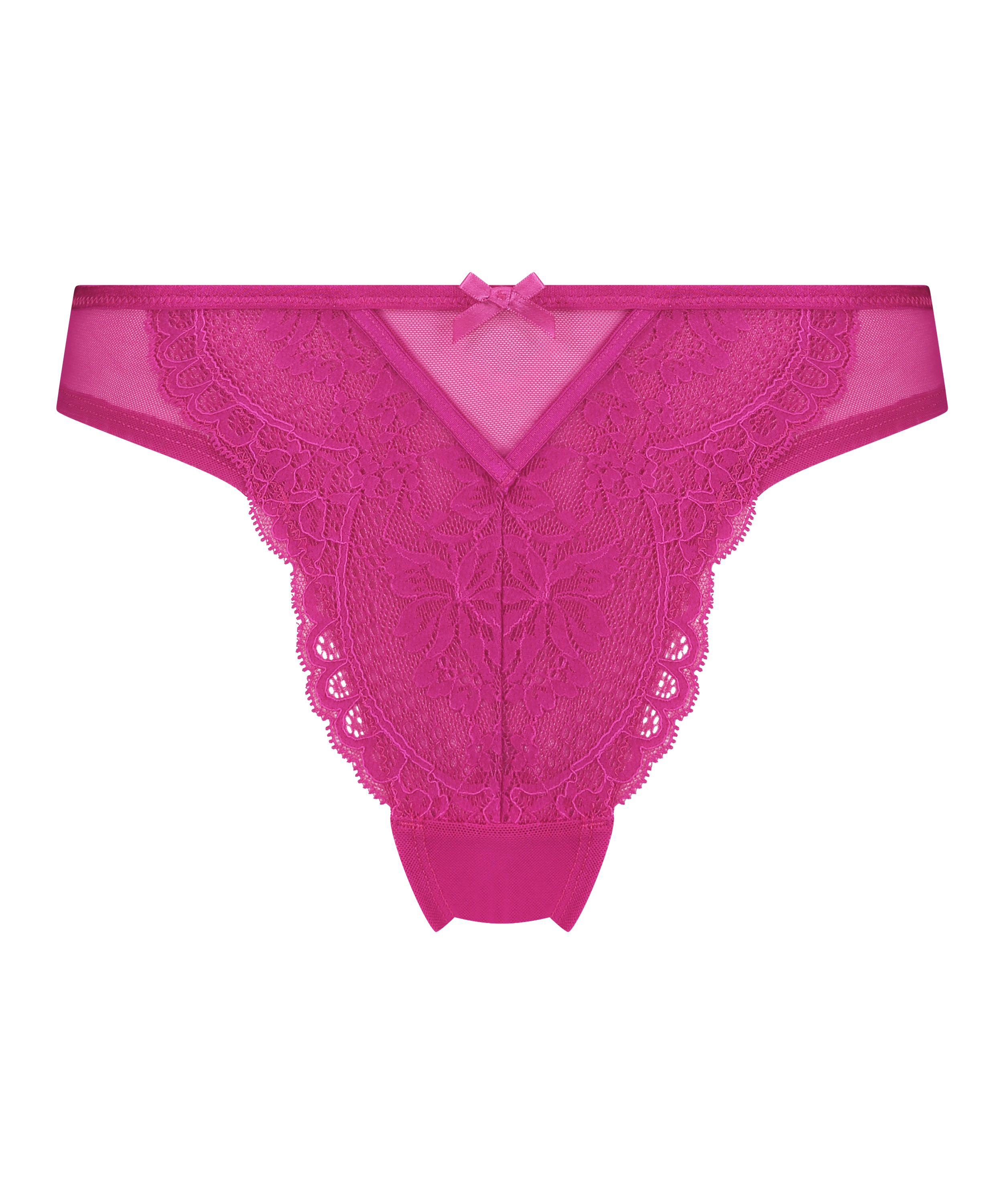Don't miss out on this beautiful brazilian! The lace on the back creates a sexy semi-transparent look. This brazilian has a high leg fit and on the front it has a beautiful small bow. Combine with the matching bra for the complete look.