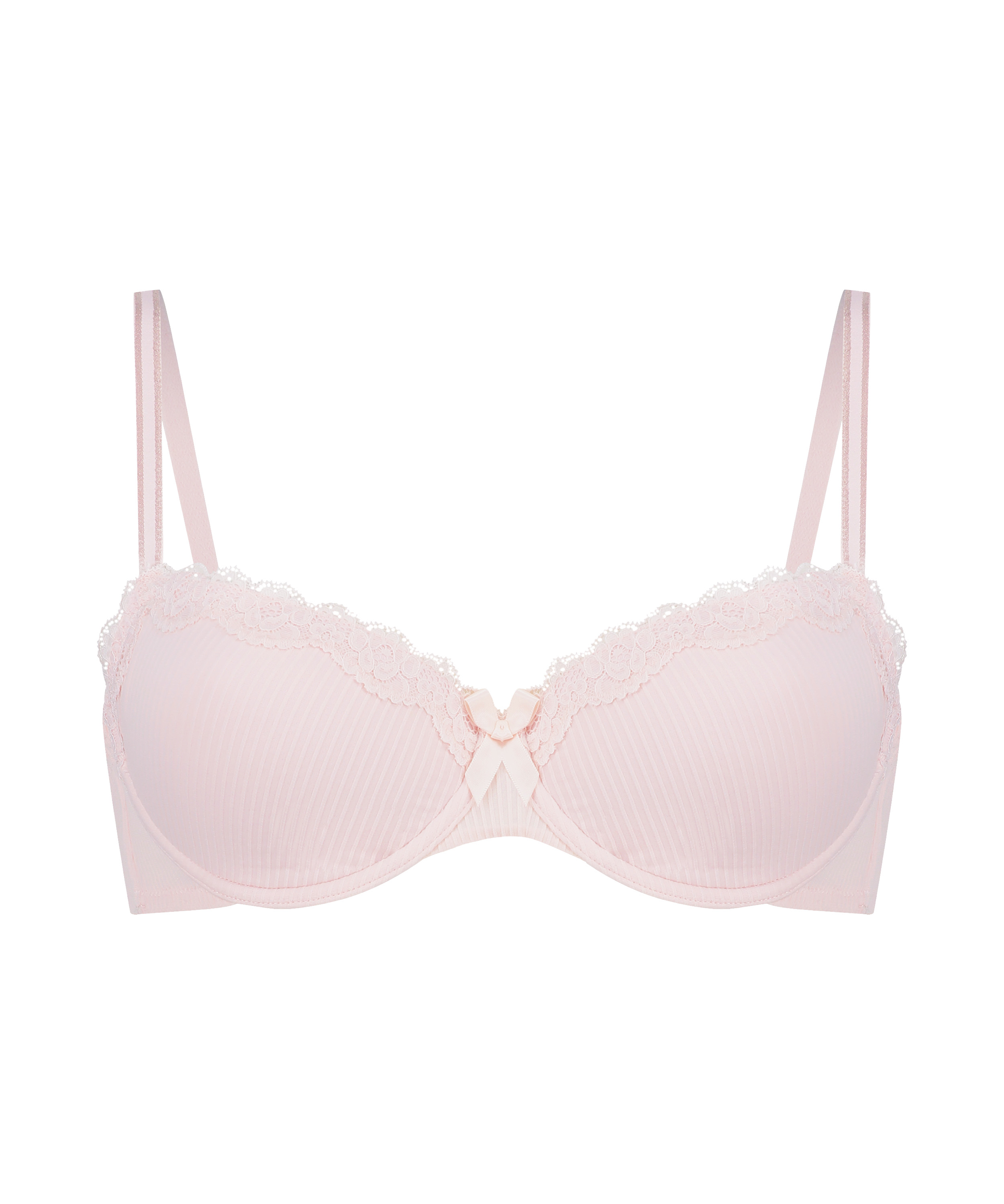 This padded underwired bra is finished with lace details on the top of the cups. Between the cups is a small bow for an extra sexy look. Mix with the matching items!
