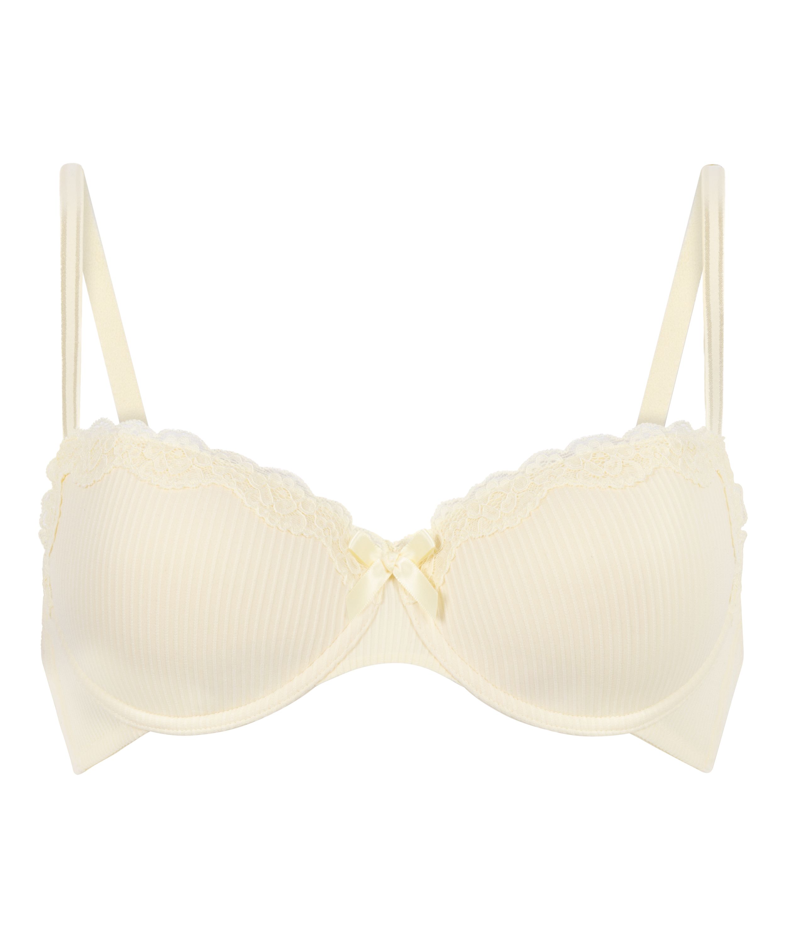 This padded underwired bra is finished with lace details on the top of the cups. Between the cups is a small bow for an extra sexy look. Mix with the matching items!