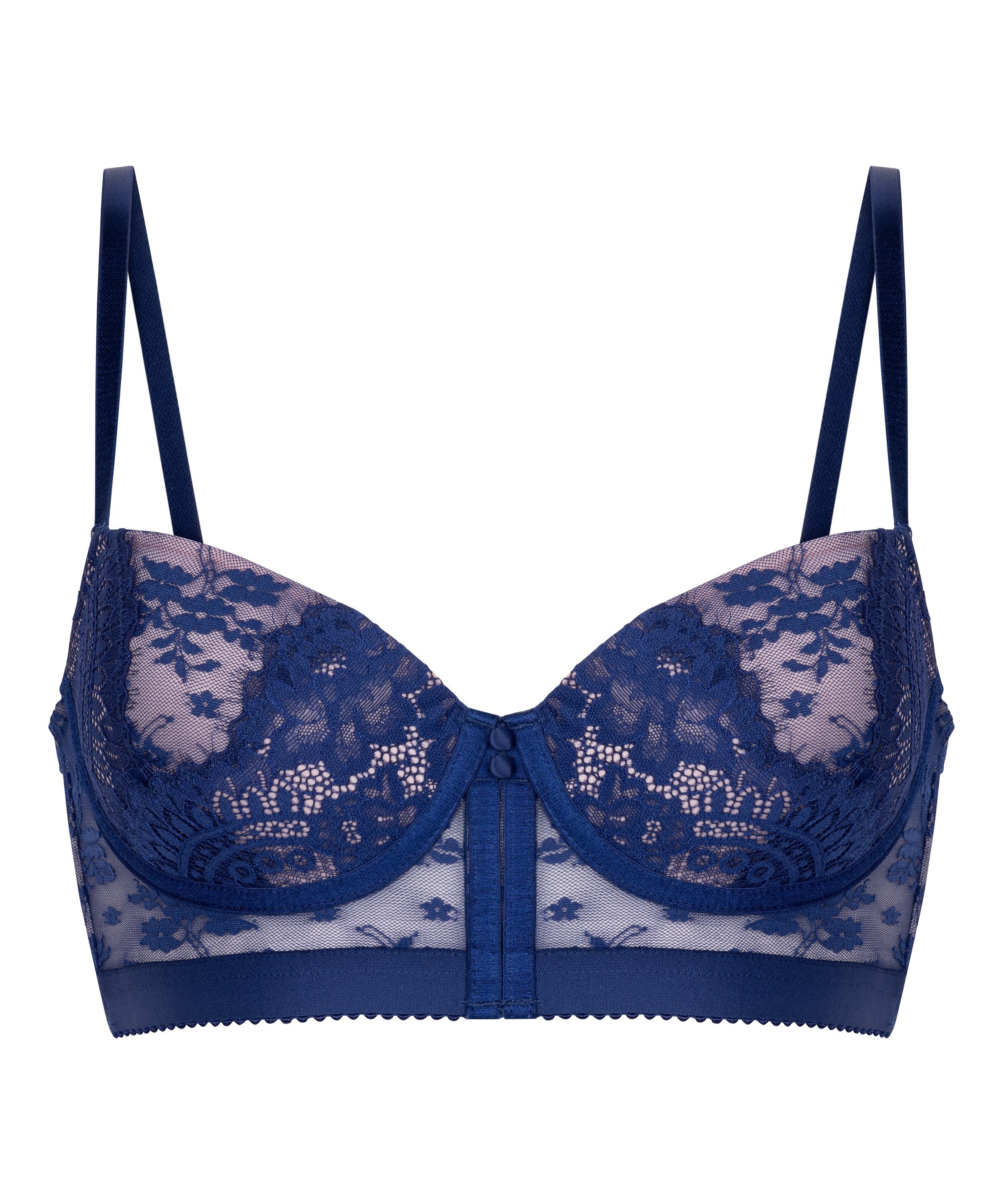 Sculpted support meets timeless charm in this bra, designed to enhance your silhouette with elegance and ease. The plunge neckline flatters the décolleté, while padded, underwired cups offer a smooth lift and shaping. Made from delicate lace and finished with vintage-inspired buttons at the center, this piece adds a romantic twist to your lingerie collection. The longline design provides extra support and a flattering fit, making it perfect for both layering and styling solo. Combine with the matching bottom for a complete look.