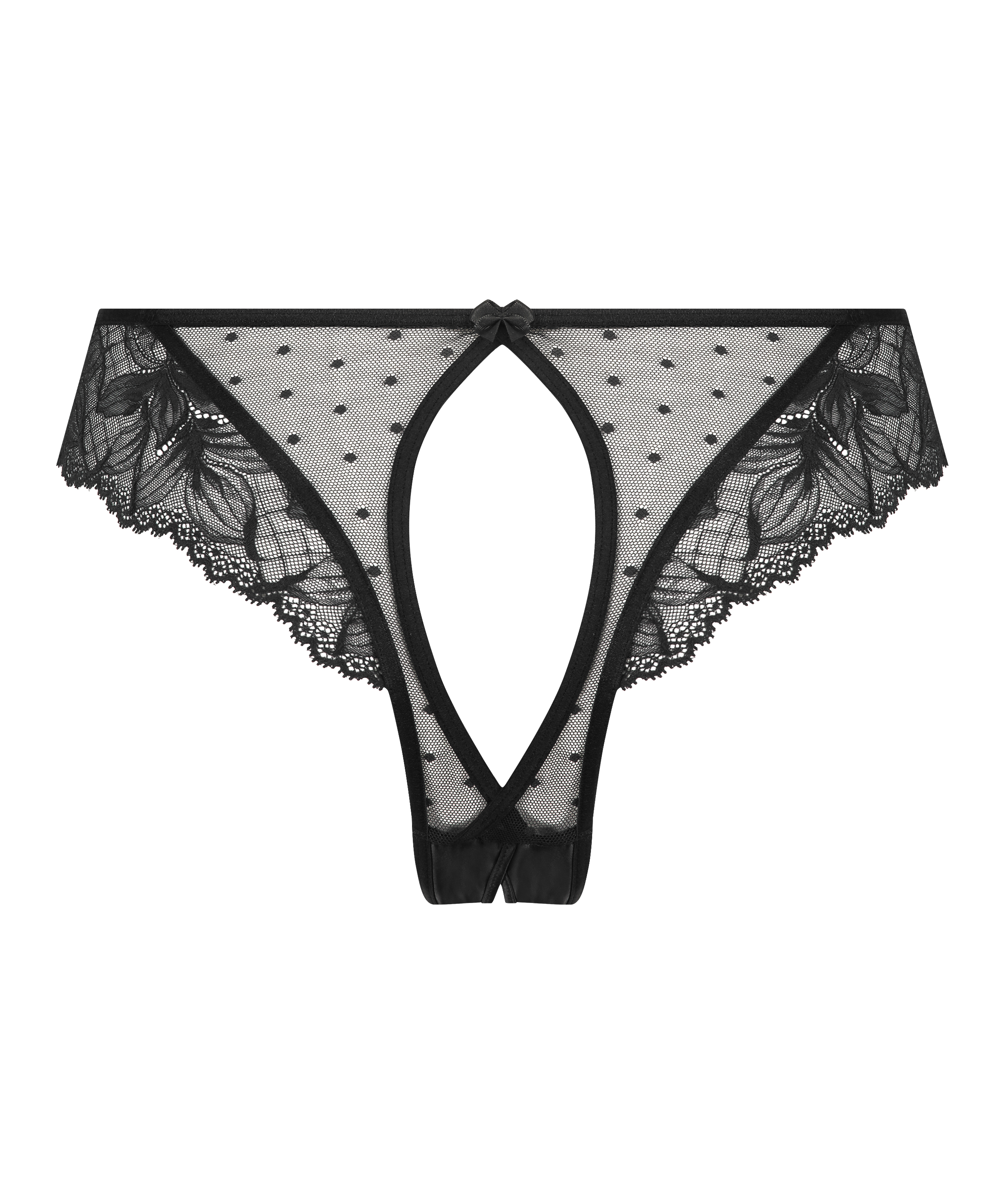 Spice things up with this unique brazilian with open crotch. With an overall mesh look with lace details on the hips. There's a lovely lace skirt on the hips and the open crotch makes it extra exciting. It also features sexy cut out details and cute bows on the front and back. Complete the set with the matching bra! Part of our Private Collection.