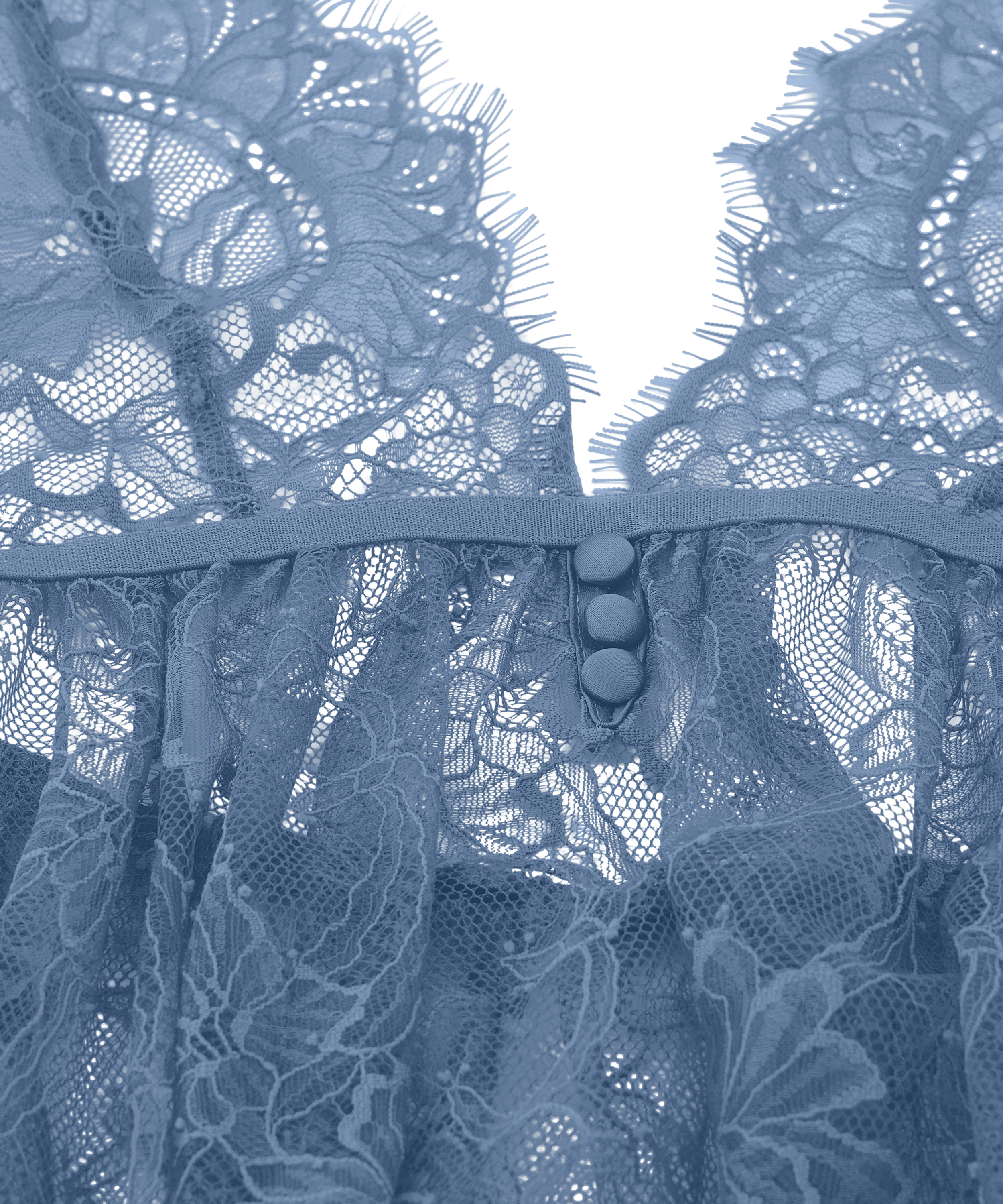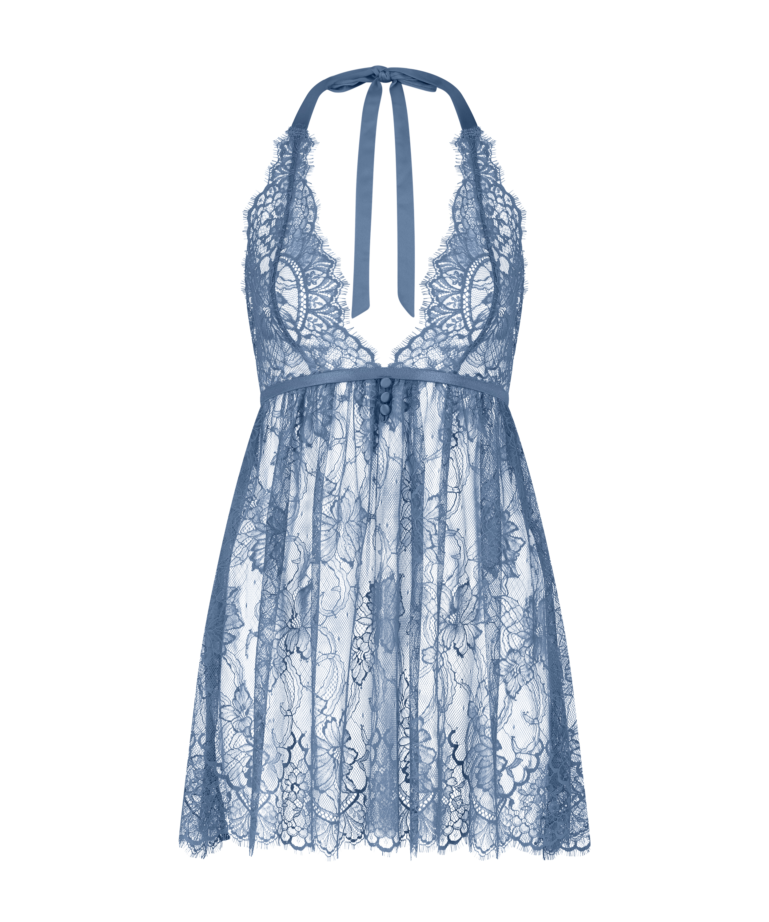 Feel sexy in this all over lace slip dress! It has a semi-transparent look, with unpadded cups. There is a romantic and easy wear neck tie for easy closure. Pair with a matching pair of knickers! Part of our Noir Collection.
