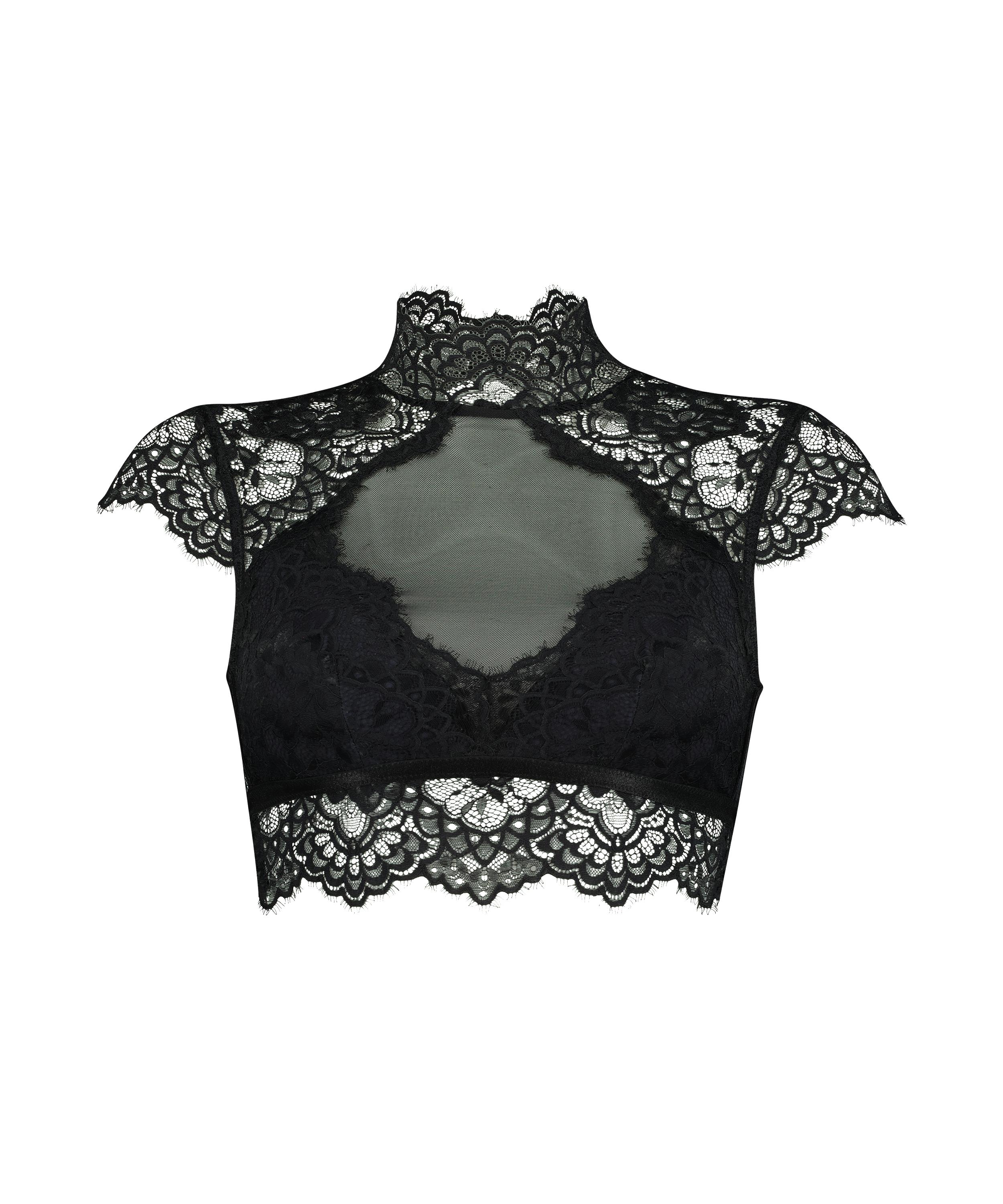 Feel sexy in this bralette top! The bralette is made of lace, has cap sleeves, a sexy open back and satin buttons on the back of the collar. The top is also perfect to wear on a night out!