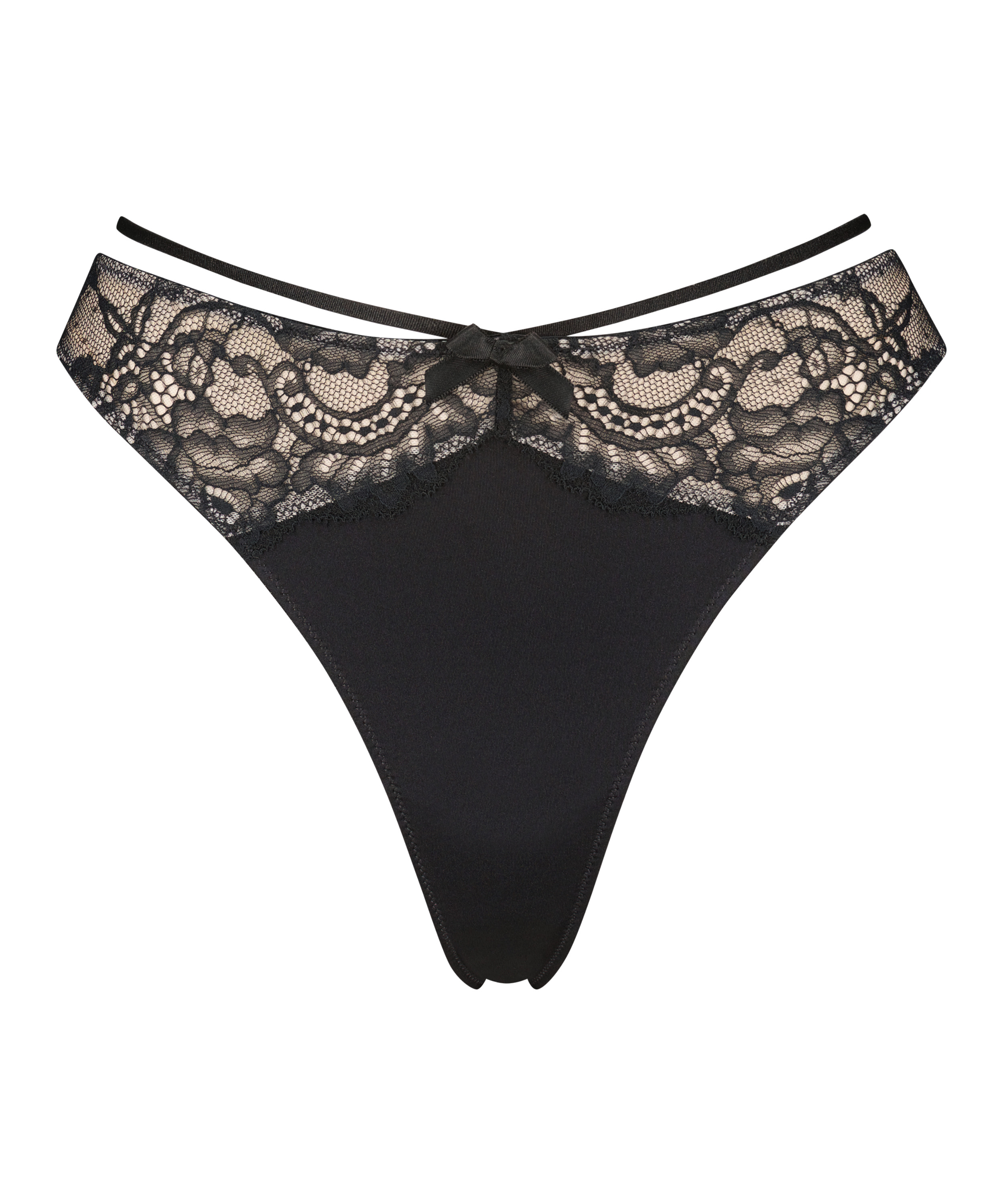 These playful knickers are super fun! The thong has strappy details at the top with details in lace. And it has a cute bow. Combine with a matching bra.