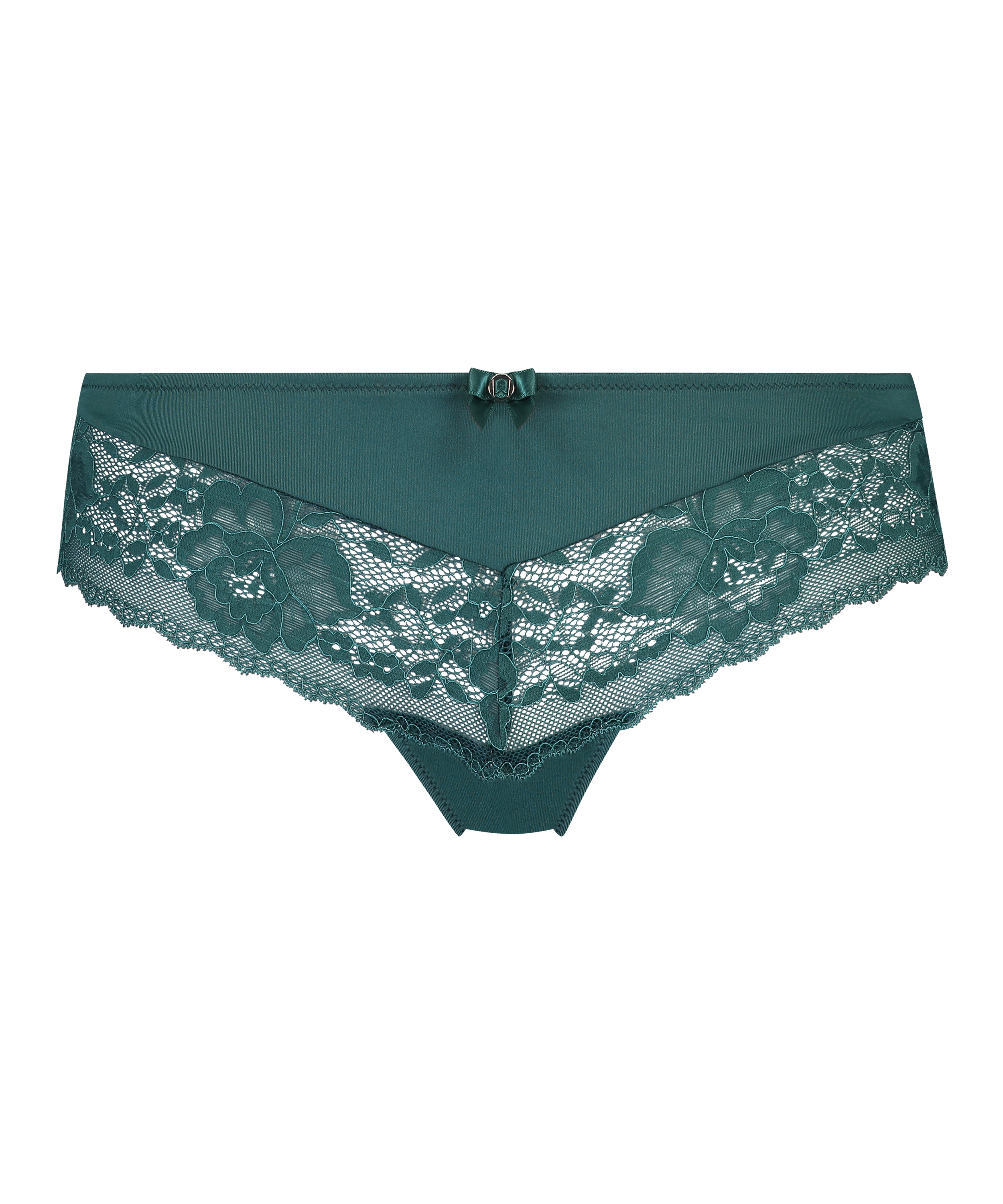 These Brazilian knickers feature a combination of semi-transparent lace and shiny fabric. The small bow on the front adds a pretty finishing touch. Combine with the matching bra for a complete set.