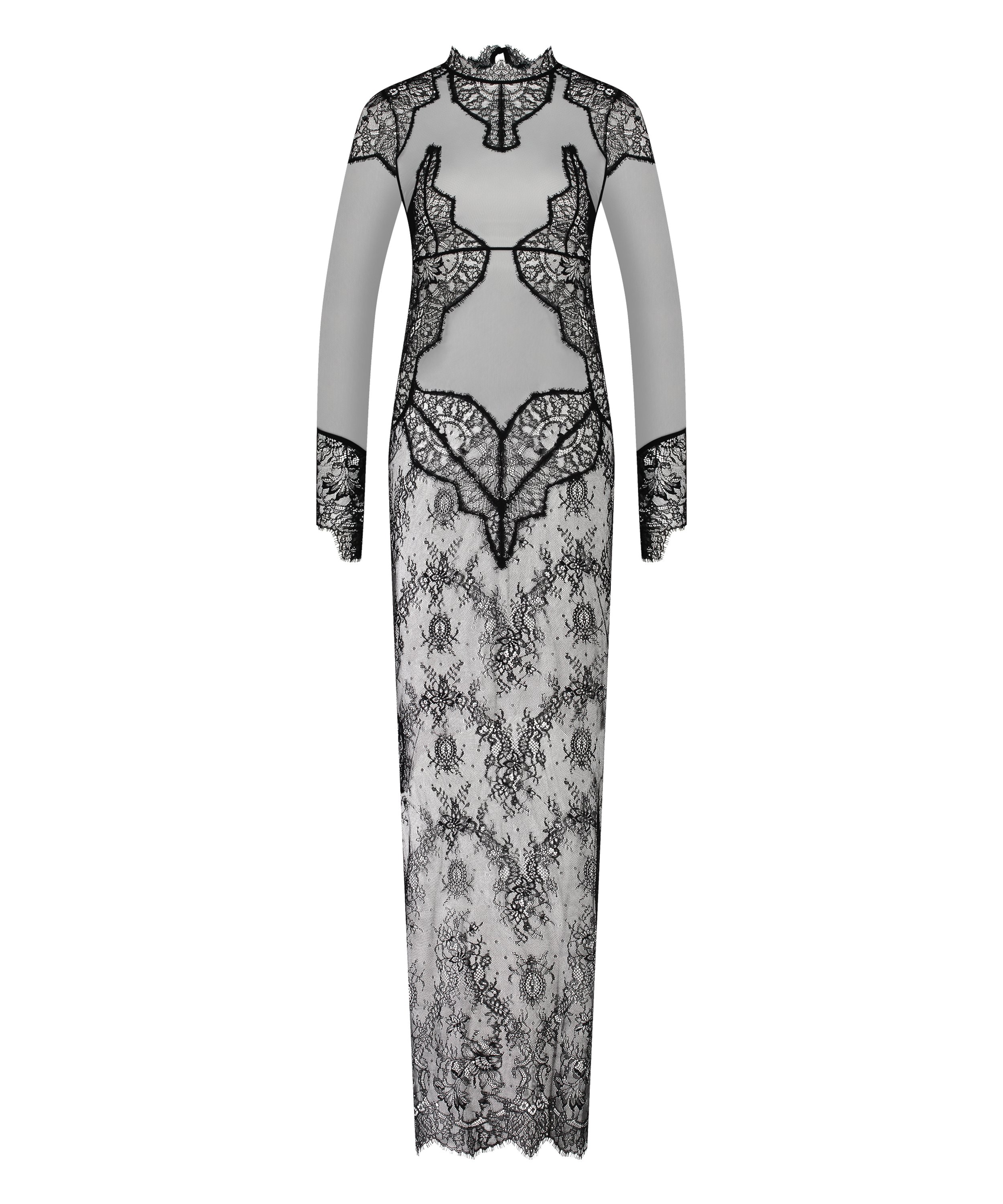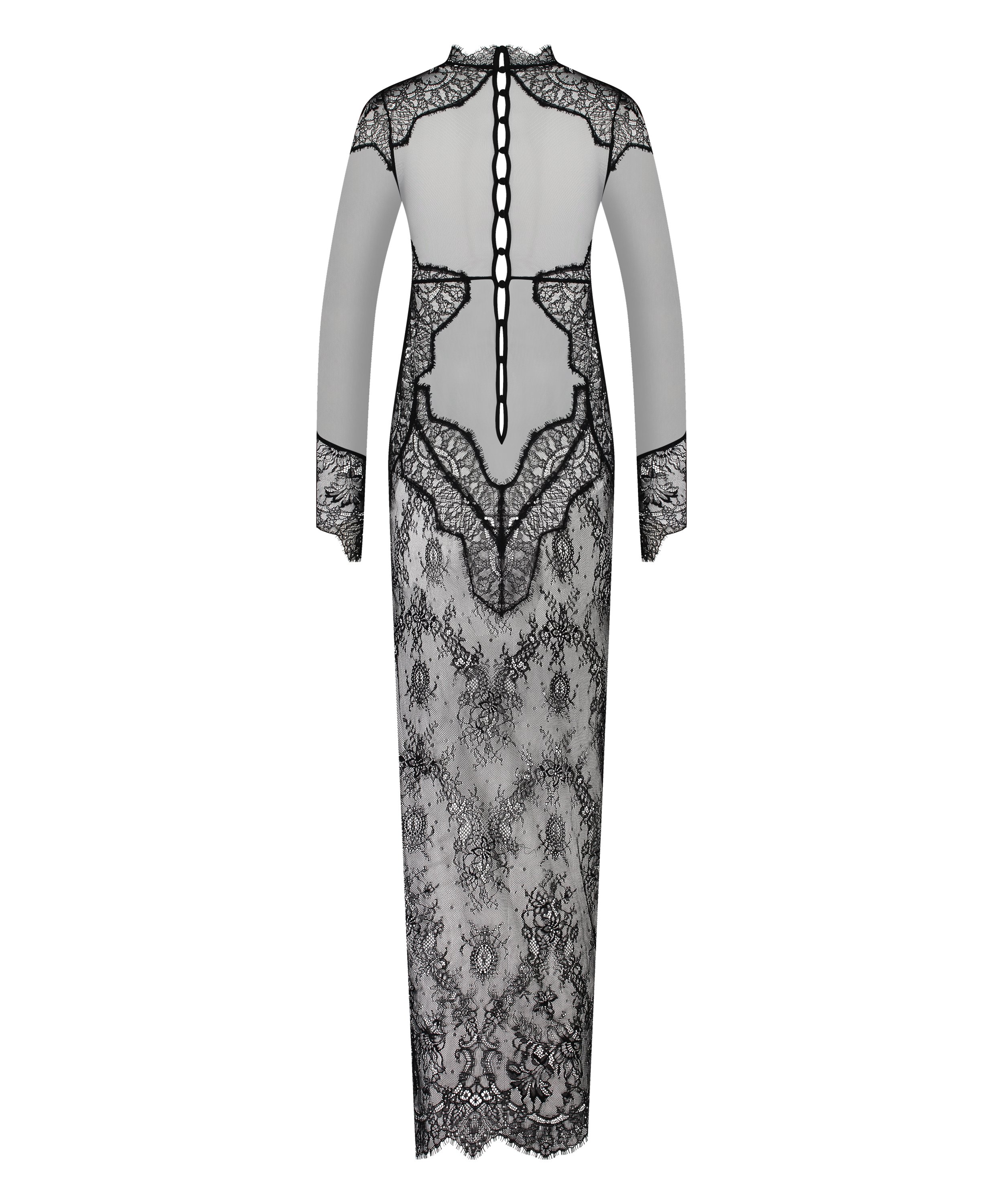Indulge in elegance with this long slip dress! This captivating piece boasts a mesh-covered top with lovely lace details, complemented by a flirtatious side split and chic turtle neck. With its long sleeves and button closure on the back, it exudes sophistication and charm. Combine it with your favorite lingerie set to complete the look!