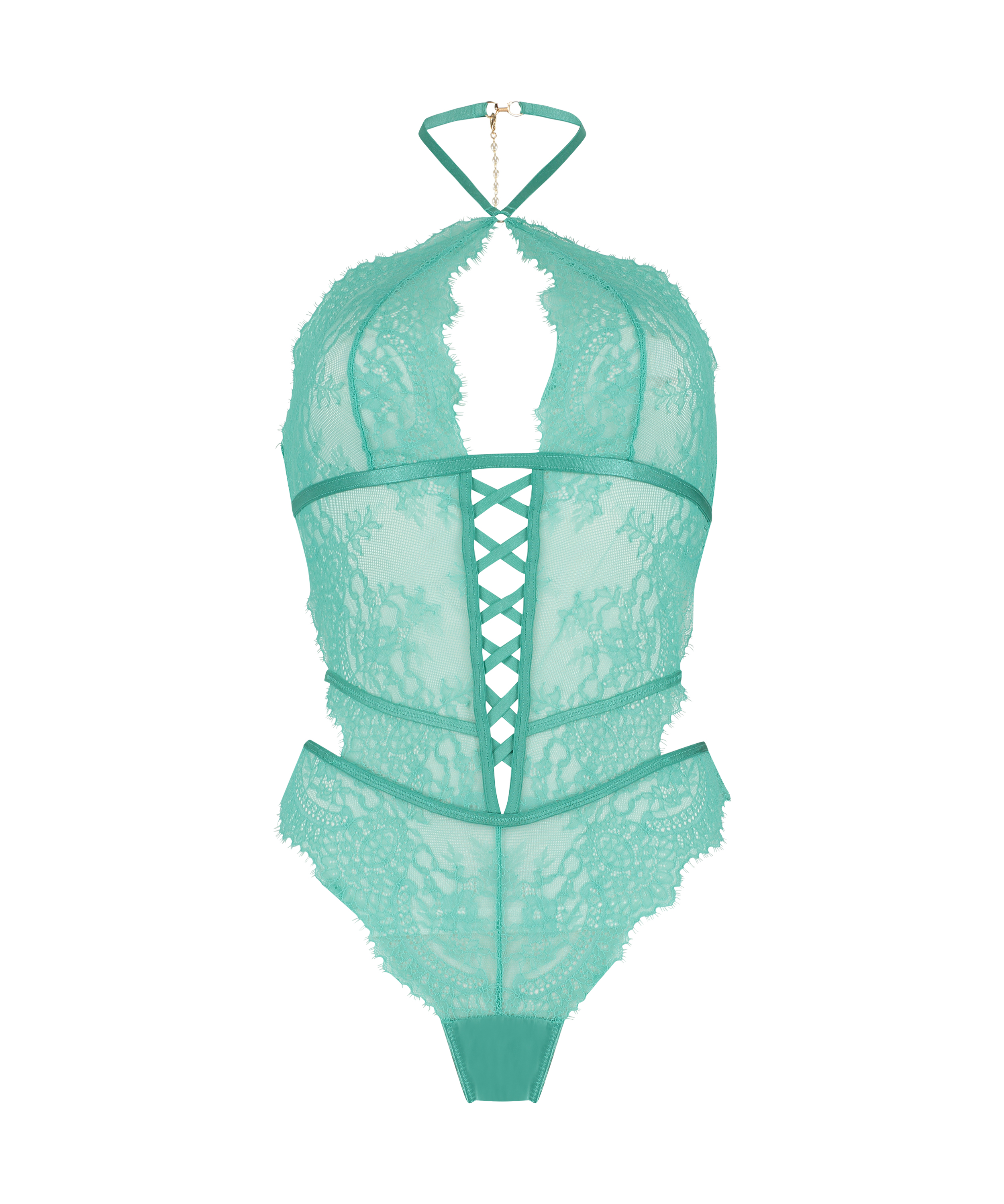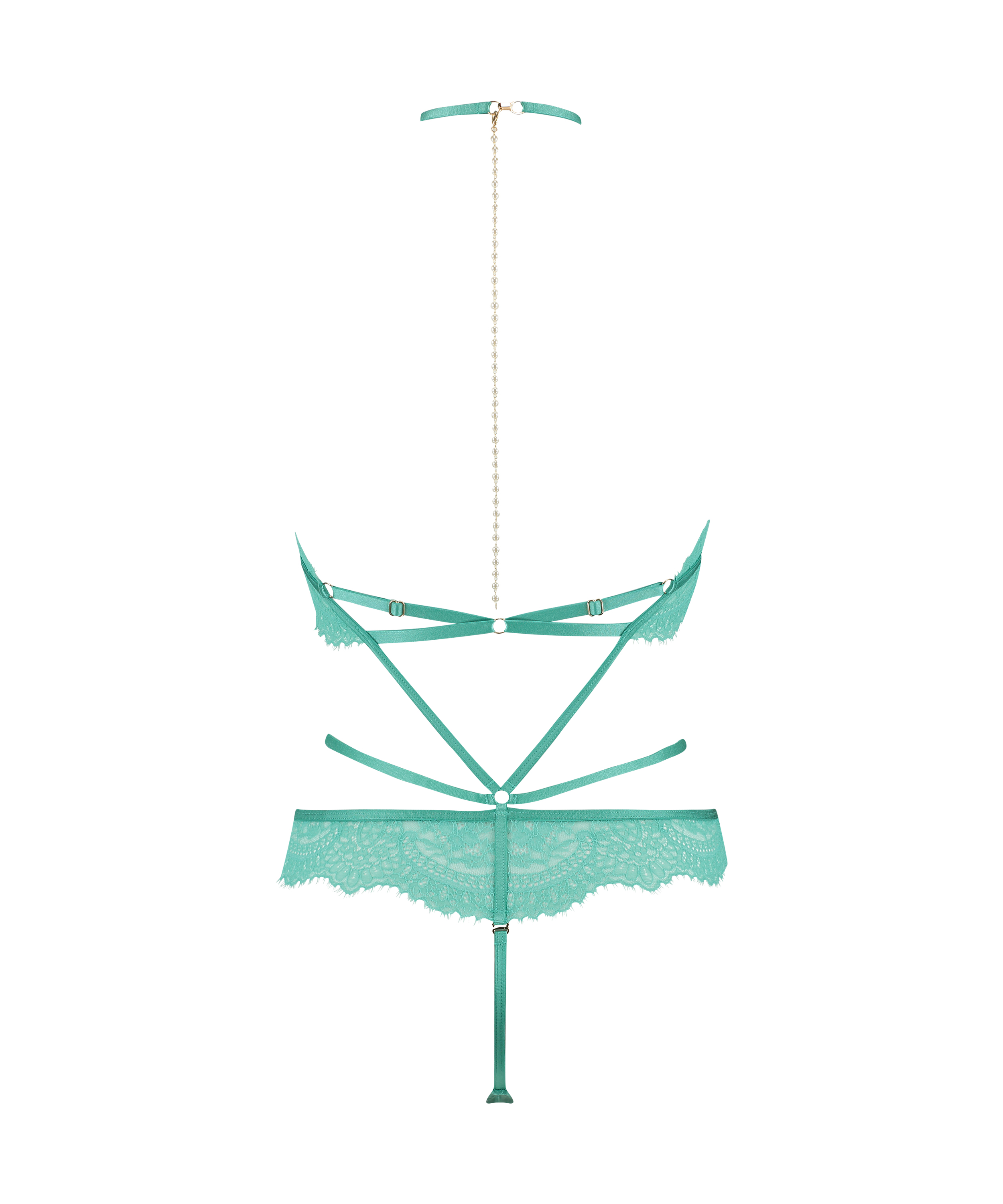 Feel sexy in this body! With an all over lace semi-transparent look. With lots of frontal and back strappy details for spicy elements. The back is decorated with a lovely faux pearl necklace.