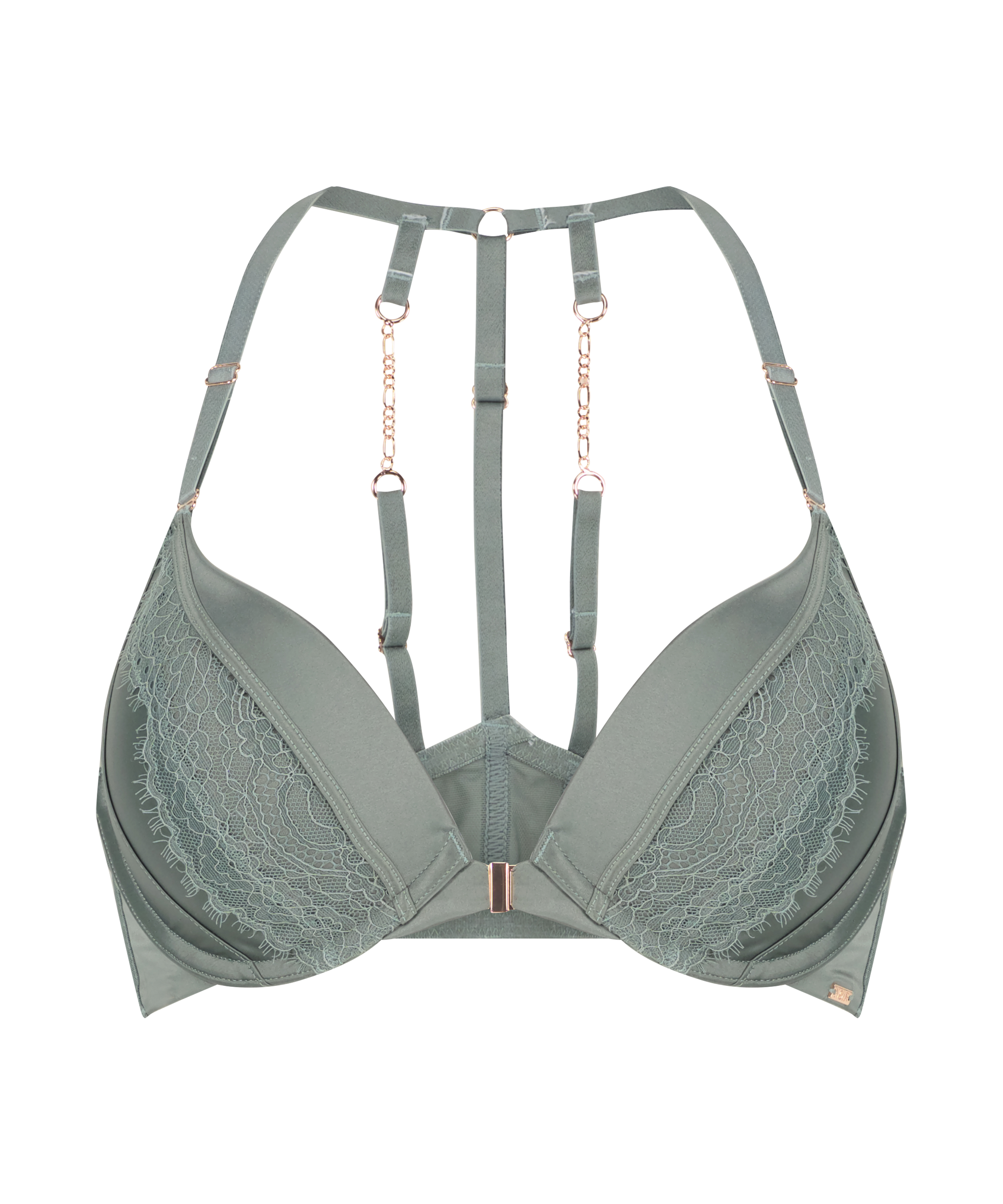 Feel sexy in this push-up bra! It has a front closure and adjustable strappy details on the back. A lace detail is incorporated on the cups. Complete your set with one of the matching knickers. Part of our Noir collection.