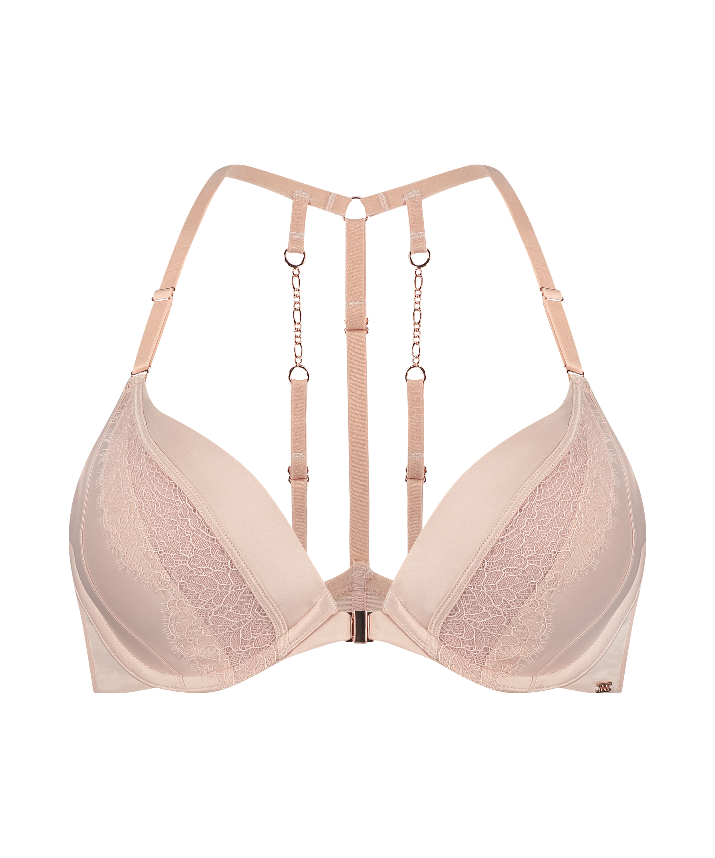 Feel sexy in this push-up bra! It has a front closure and adjustable strappy details on the back. A lace detail is incorporated on the cups. Complete your set with one of the matching knickers. Part of our Noir collection.