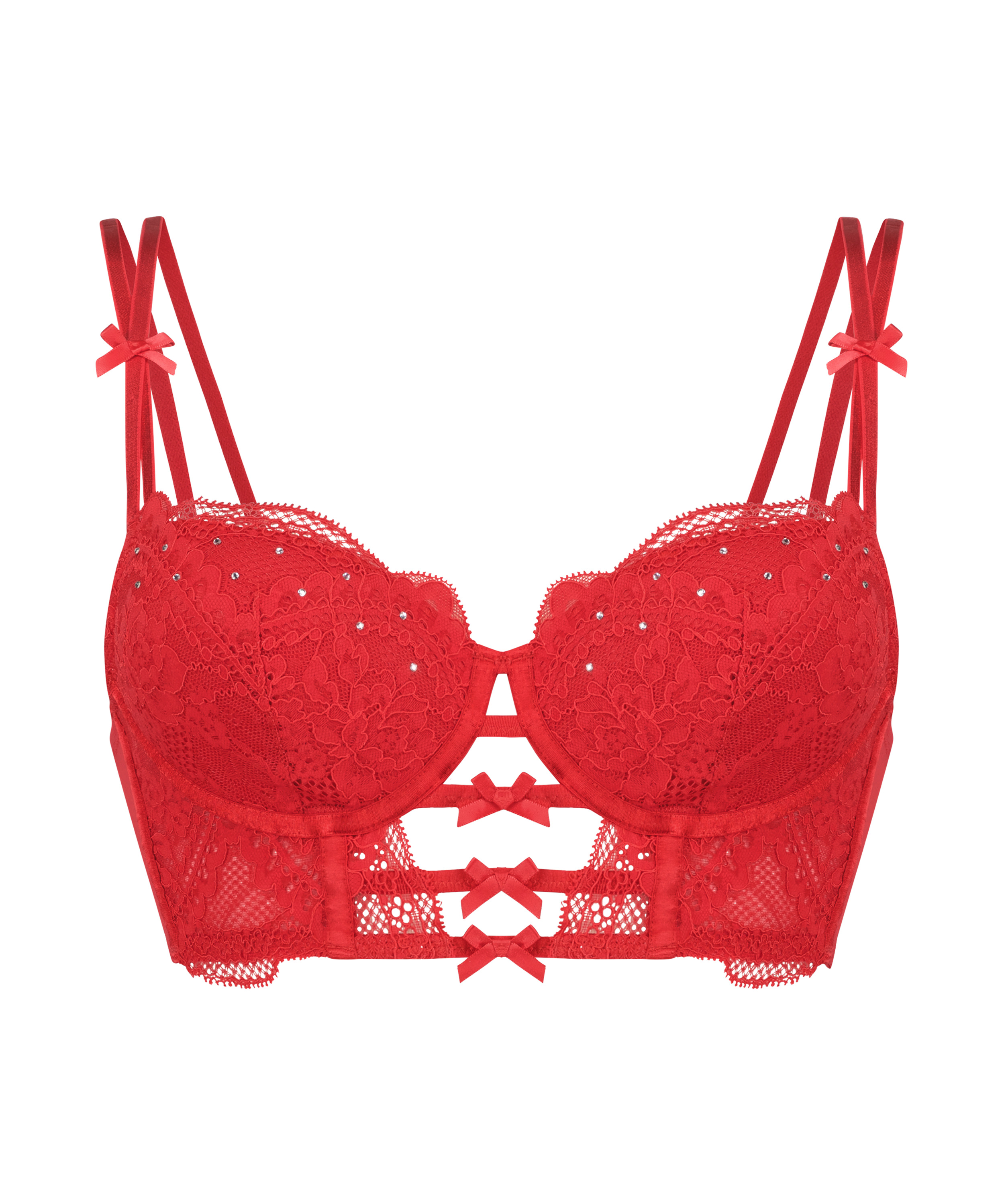 This elegant longline bra is padded and underwired. The bra has lots of lace, a bow and strappy details. Combine with matching knickers for a complete set.