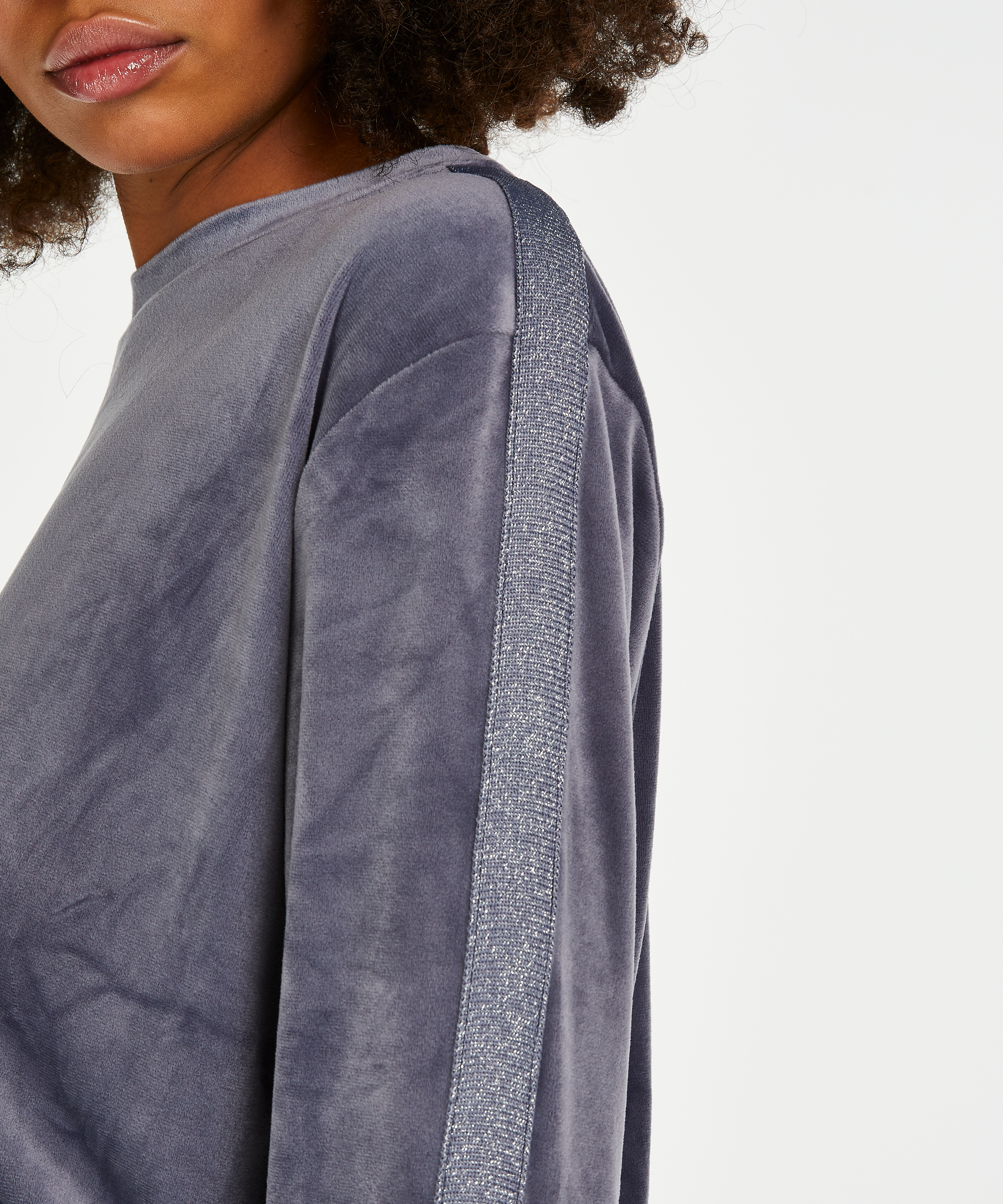 This top is comfortable and looks great! On the side of the sleeve is coloured piping. A lurex glitter iswoven into the piping. Mix with matching items!