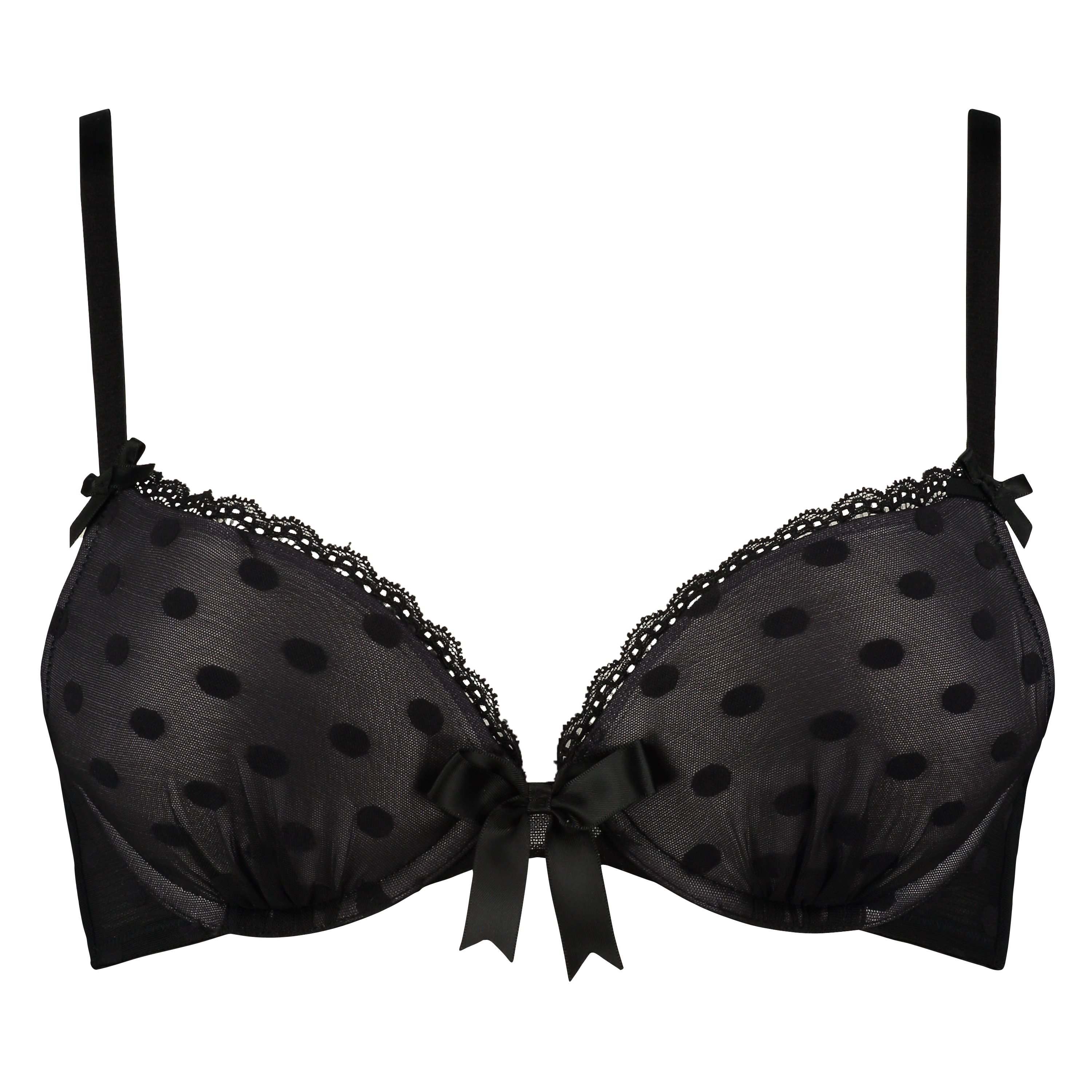 Elegant and classy: this padded and underwired push-up bra features semi-transparent black fabric with dots. A small bow between the cups adds a finishing touch.