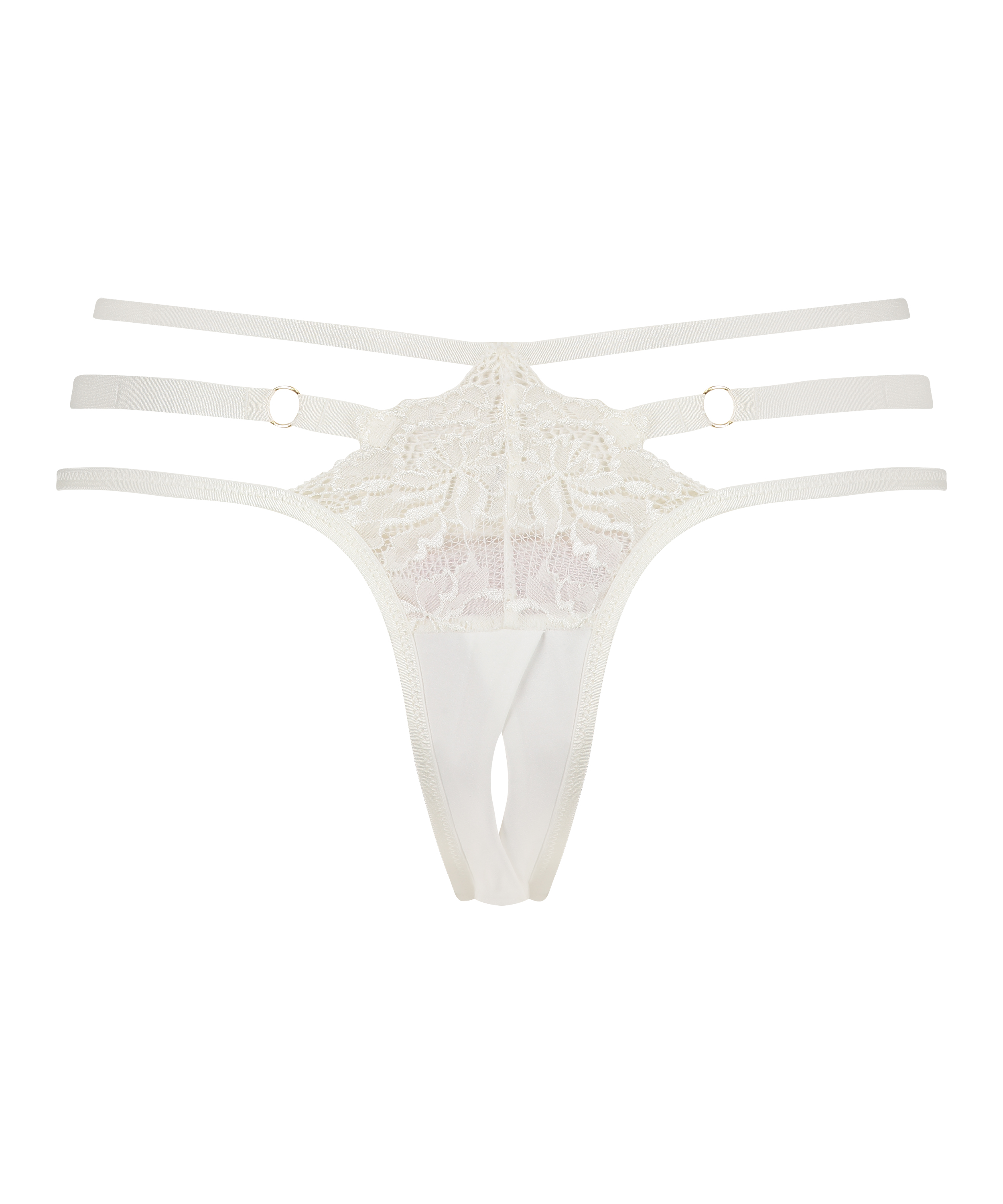 Get sexy in these open crotch Brazilian knickers from the Private Collection. With strappy detailing and lace and gold rings as an extra touch. Combine with matching items for a complete look!