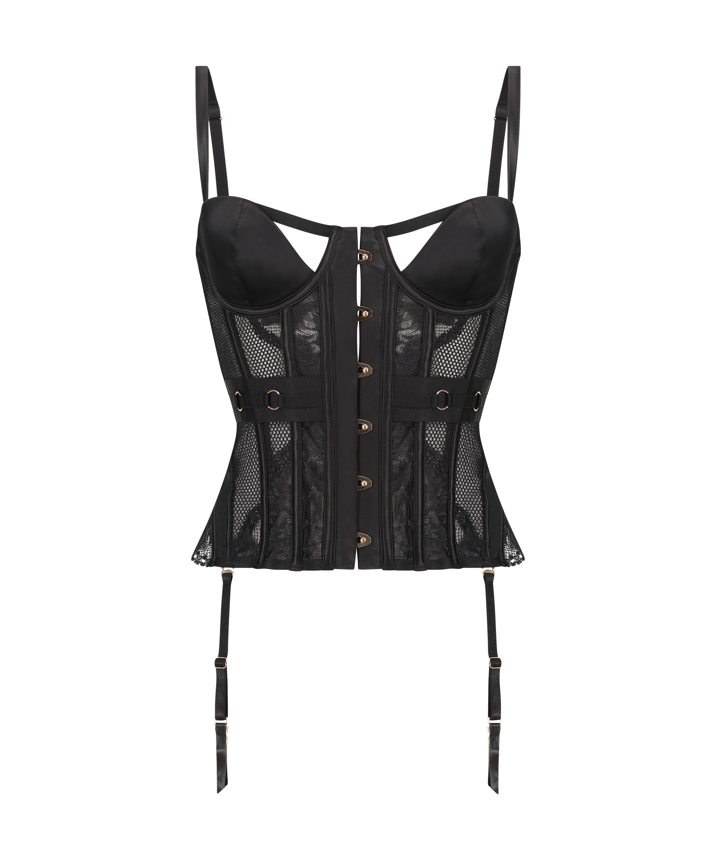 Explore your seductiveness with this sexy bustier! Made with transparent fish net material, decorated with lots of lace. The underwired cups are made of a satin material. It has frontal closure with spicy hardware. The frontal and back boning make for a comfortable wear, and the strappy details around the waist aid in a snatched look. There is the possibility to tighten the back with a tightening rope feature to make sure it fits perfectly. Find the matching knickers and combine hosiery to complete the set!