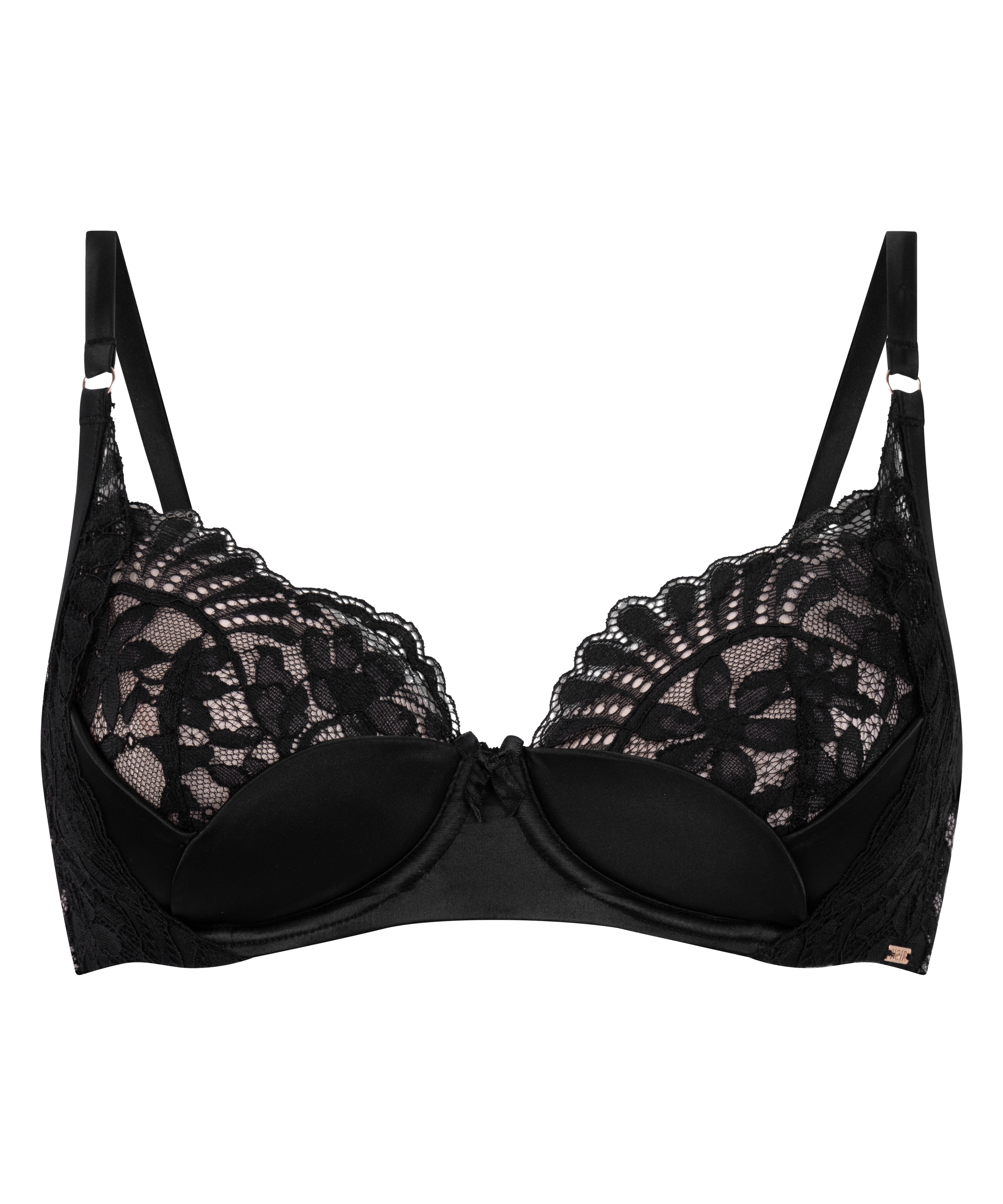 Indulge in timeless elegance with this bra. The satin fabric provides a luxurious feel and a flattering fit, while the lace accents add a romantic touch. Designed with padded cups and supportive underwires. Part of the noir collection.