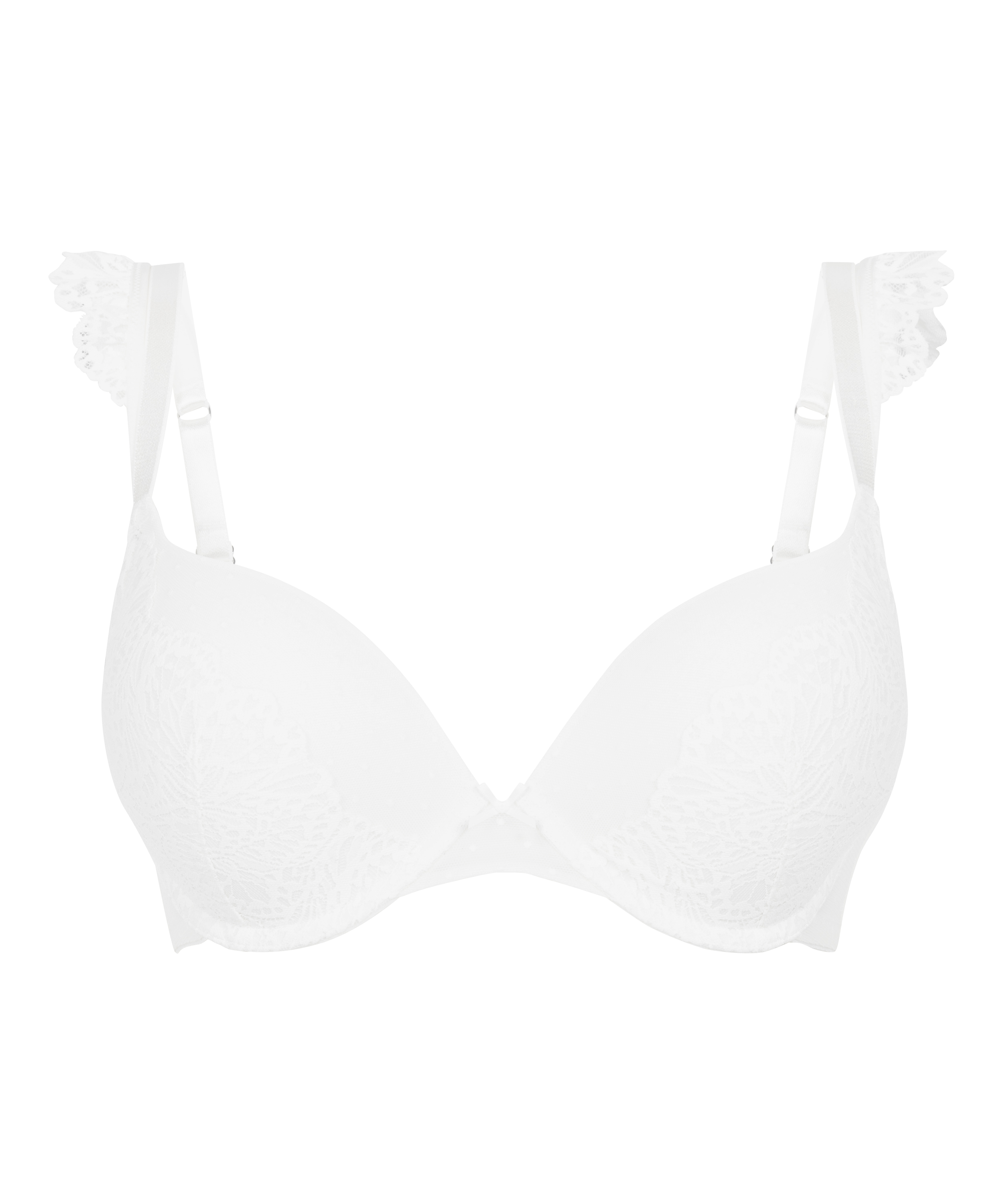 This comfortable maximizer bra is your new best friend! With fun strappy details over the breasts, paired with underwired cups for a comfortable fit. It is finished off with romantic lace details. Pair with the matching knickers!