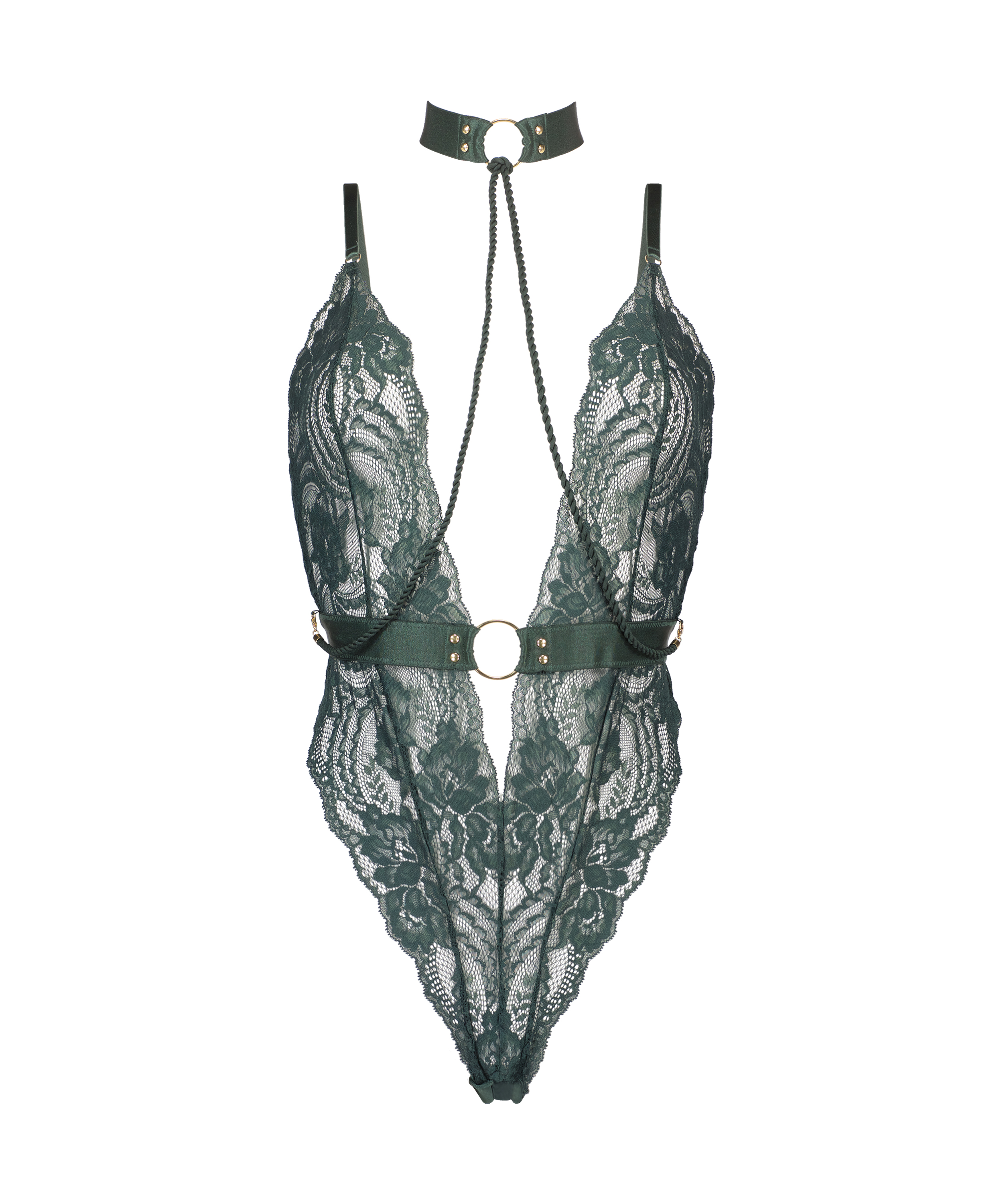 Feel seductive in this body made of lace! It has a chocker and is finished with an elastic cord that is twisted. The back is pretty open and has a cheeky cut-out, super sexy! Part of the exciting Private Collection.