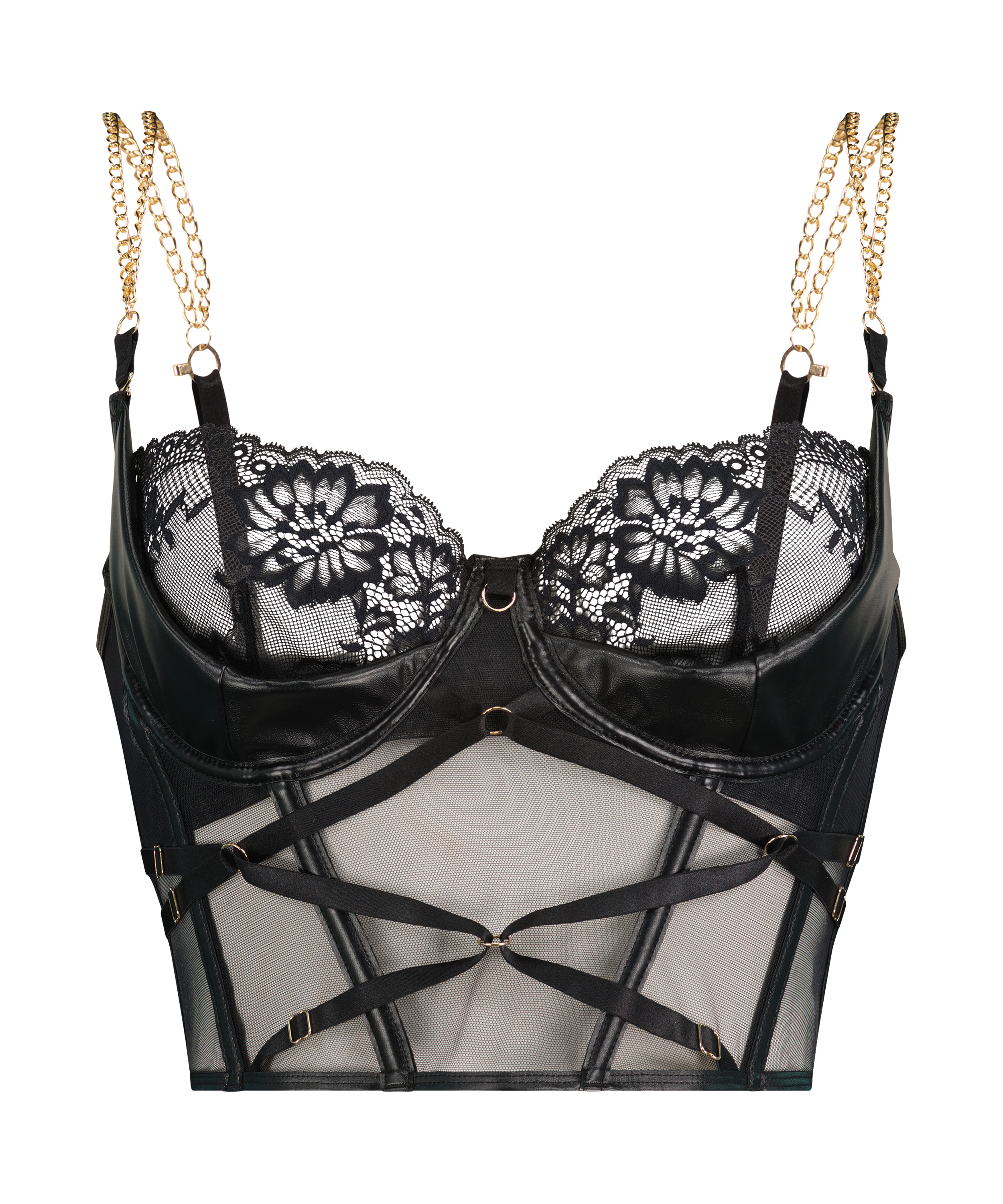 Explore your seductiveness with this sexy bustier! Made with transparent fish net material, decorated with lots of lace and strappy details. The underwired cups are made of a fake leather material. The bustier is decorated with a lovely gold chain and has frontal, side and back boning to make it more comfortable to wear. Match with the Hecate Thong to complete the set!