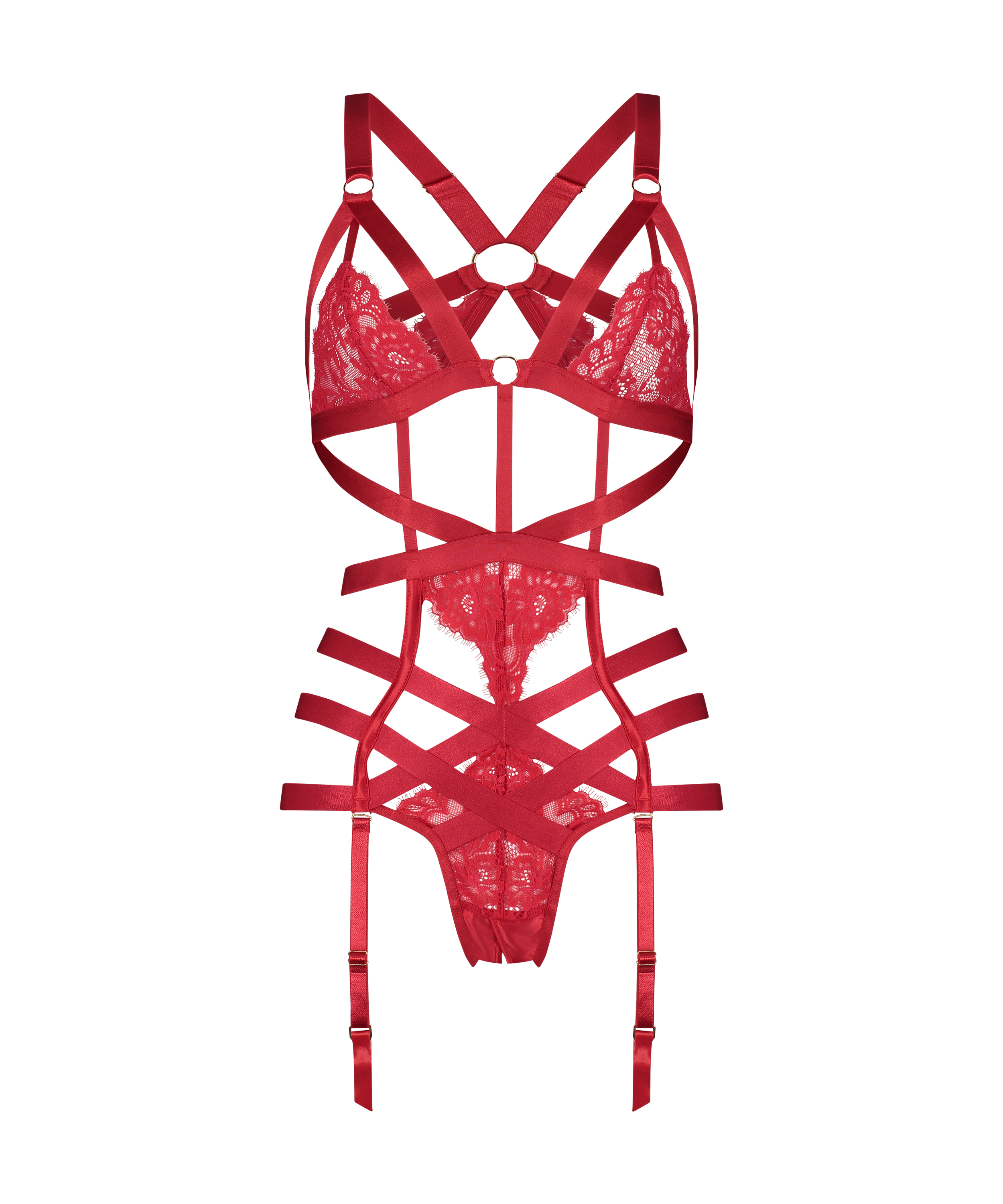 Envelope your body in this sexy body stocking! It is almost completely made of straps. It has lace over the cups. Combine with a matching kimono from our Private Collection for a complete set!