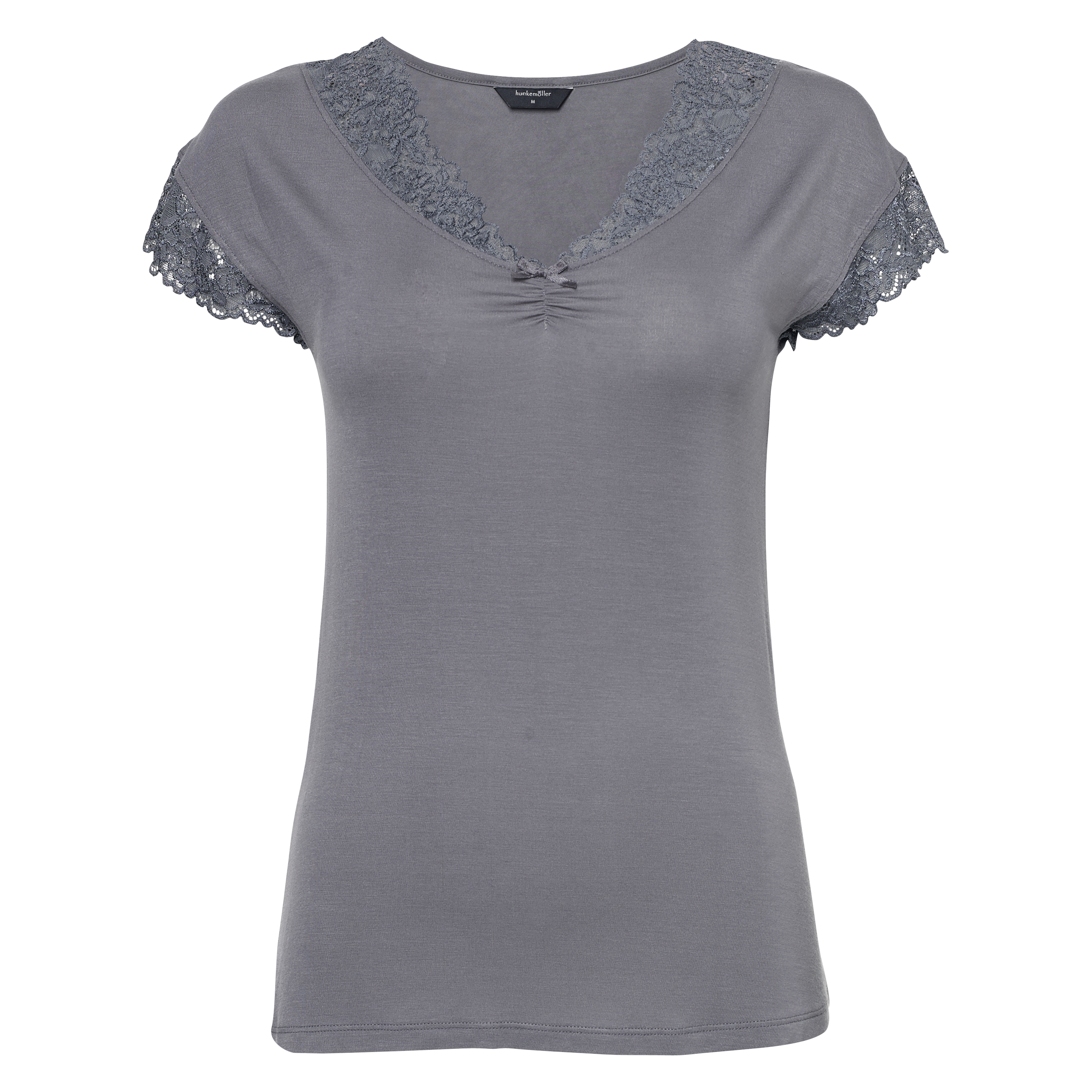 This pyjama top is made from grey fabric finished with lace details.
