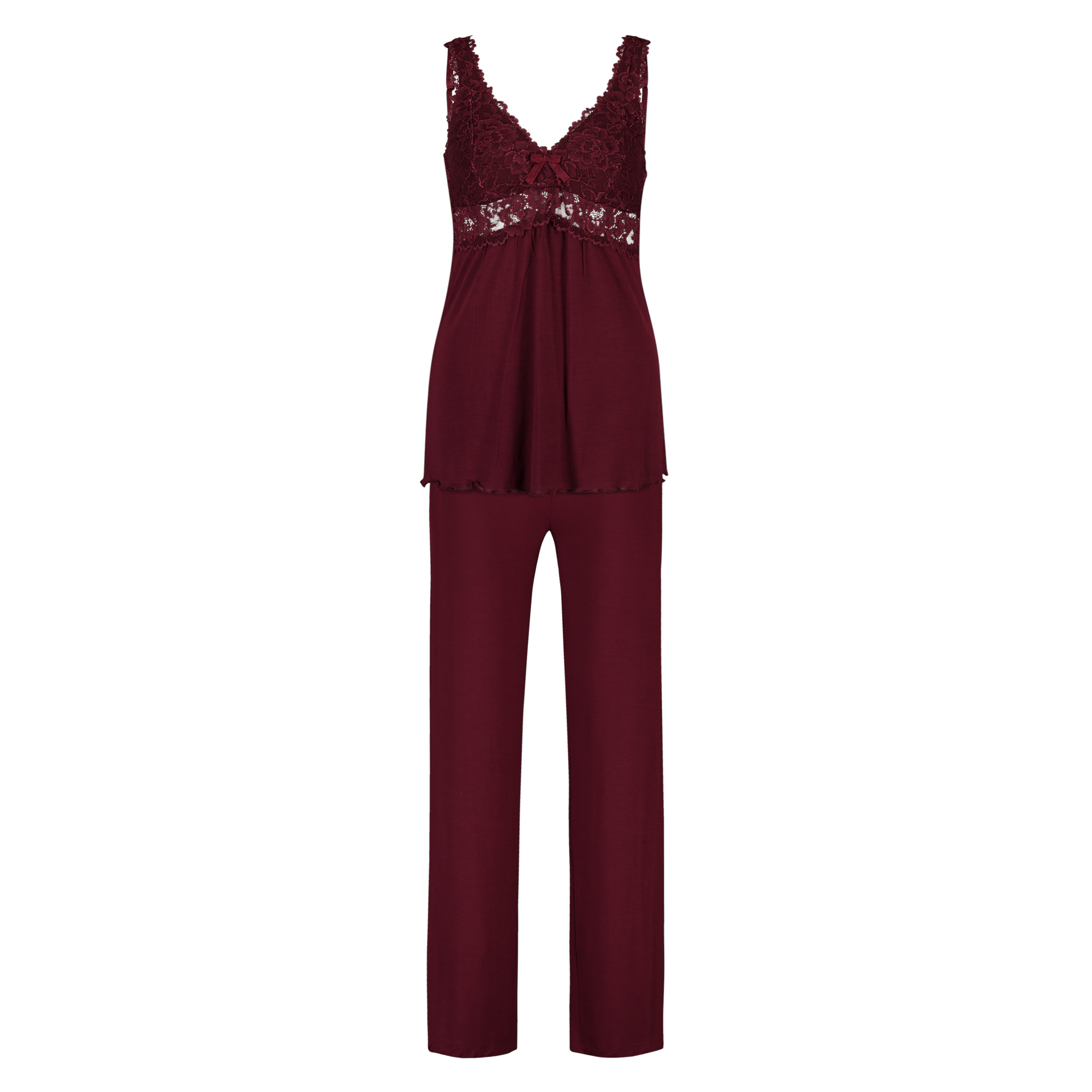 The top of these pyjamas has adjustable shoulder straps and is finished with high-quality lace. The matching pyjama pants have an elastic waist.