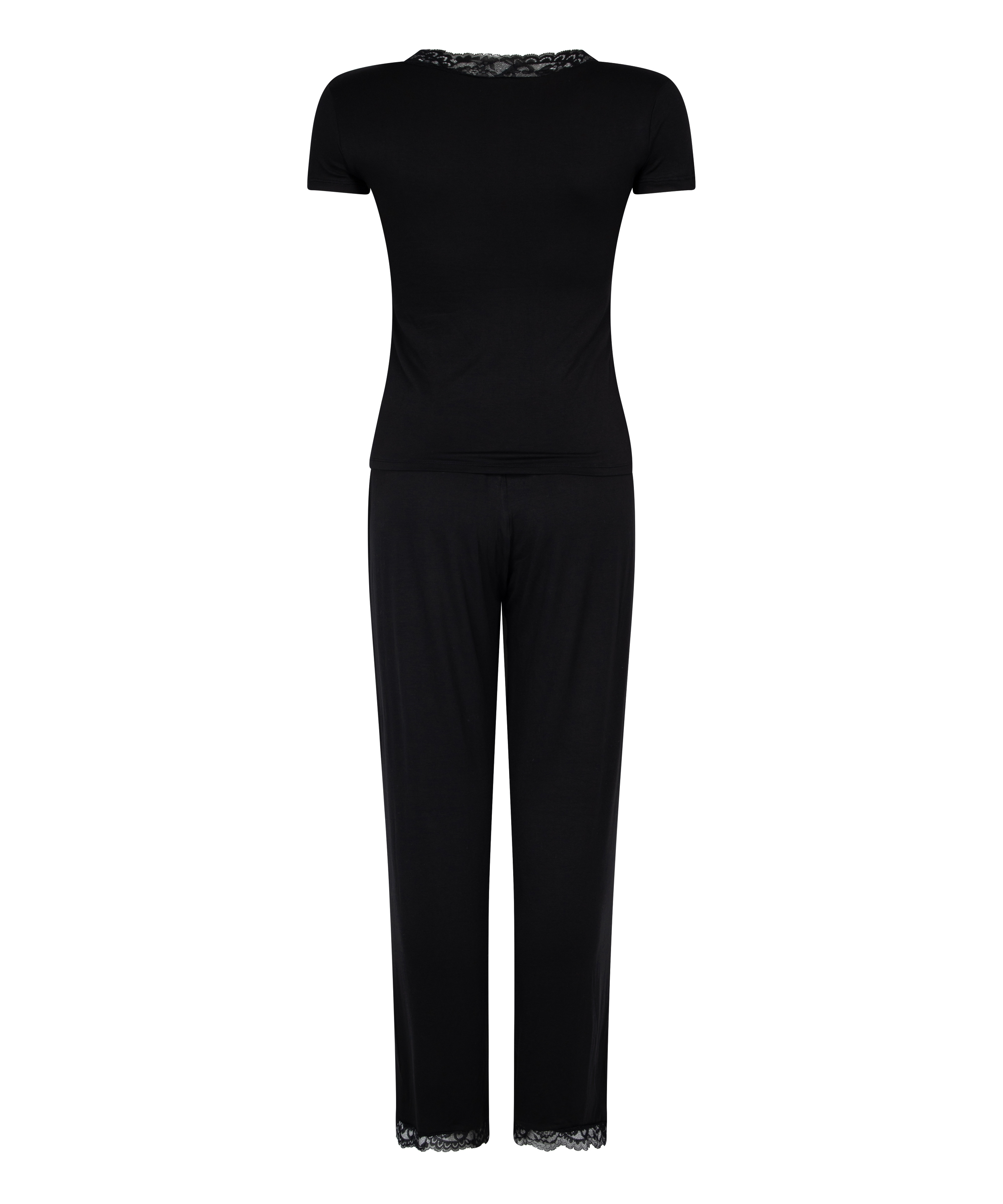 Relax in style with our pyjamaset, desgined for ultimare comfort and elegance. This two-piece set features soft, breathable top with short sleeves and a flattering V-neckline adorned with lace. Paired with long, flowy pants for a relaxed fit and lace details on the bottom. This set is perfect for lounging or a peaceful night's sleep.