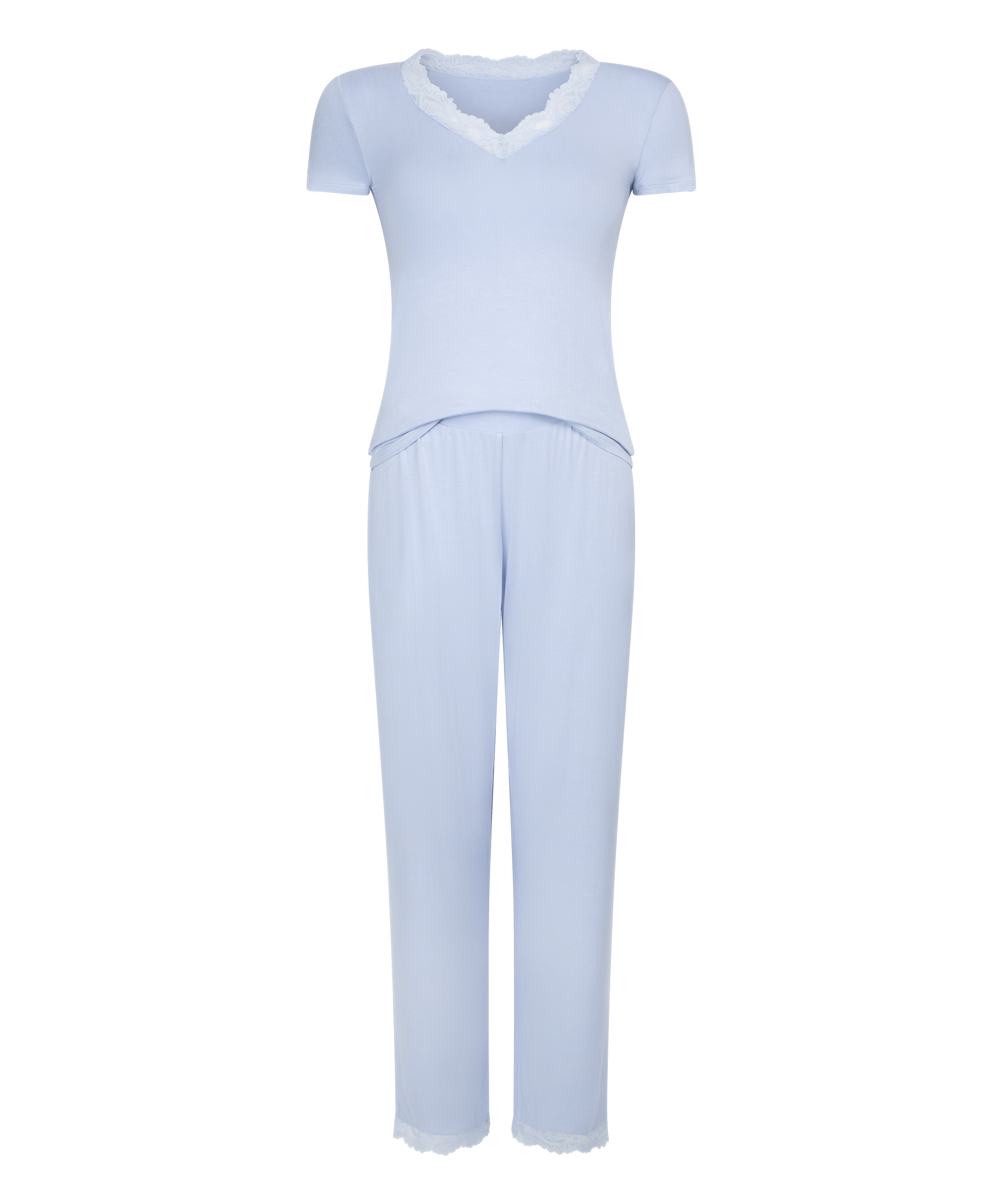 Relax in style with our pyjamaset, desgined for ultimare comfort and elegance. This two-piece set features soft, breathable top with short sleeves and a flattering V-neckline adorned with lace. Paired with long, flowy pants for a relaxed fit and lace details on the bottom. This set is perfect for lounging or a peaceful night's sleep.
