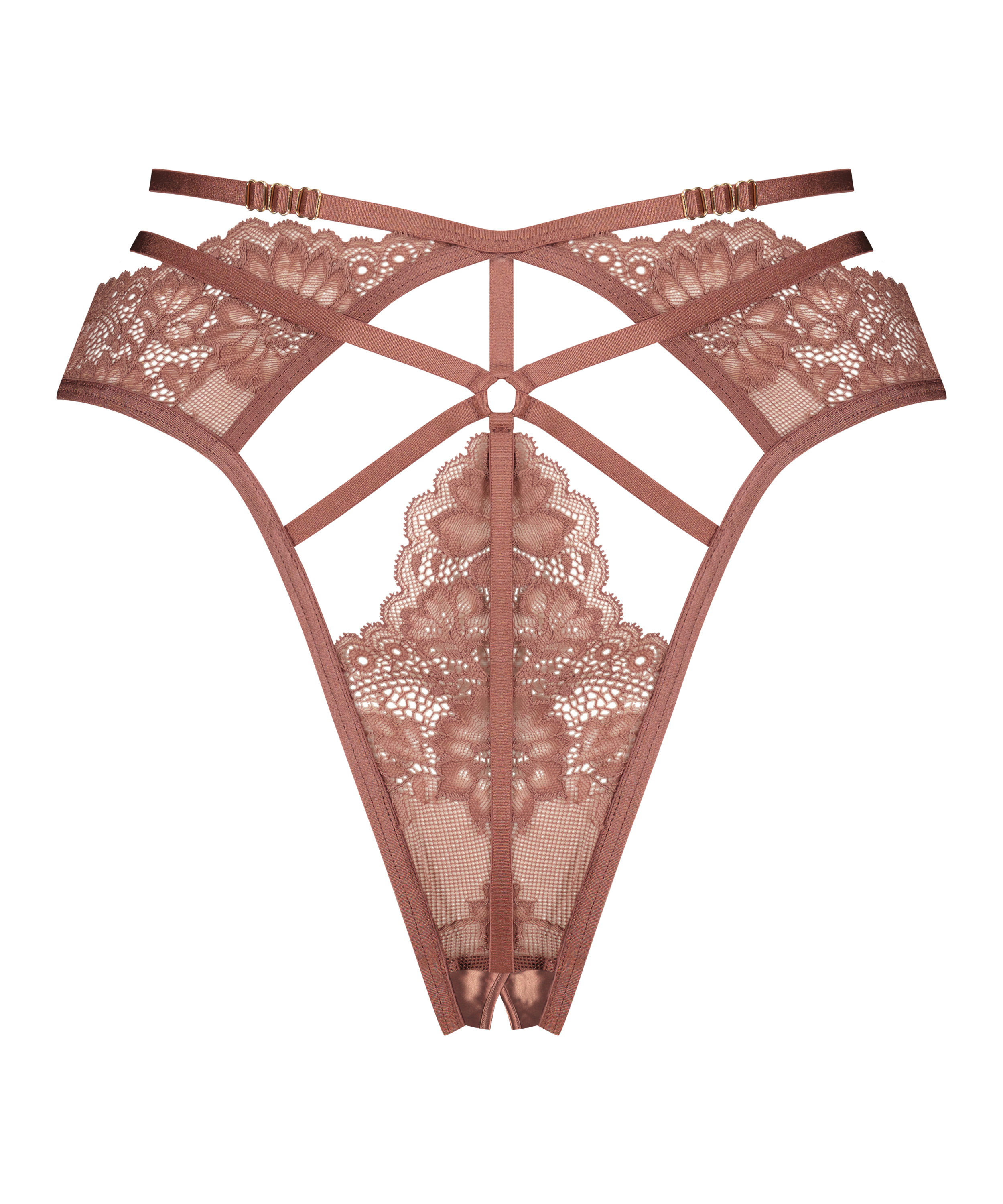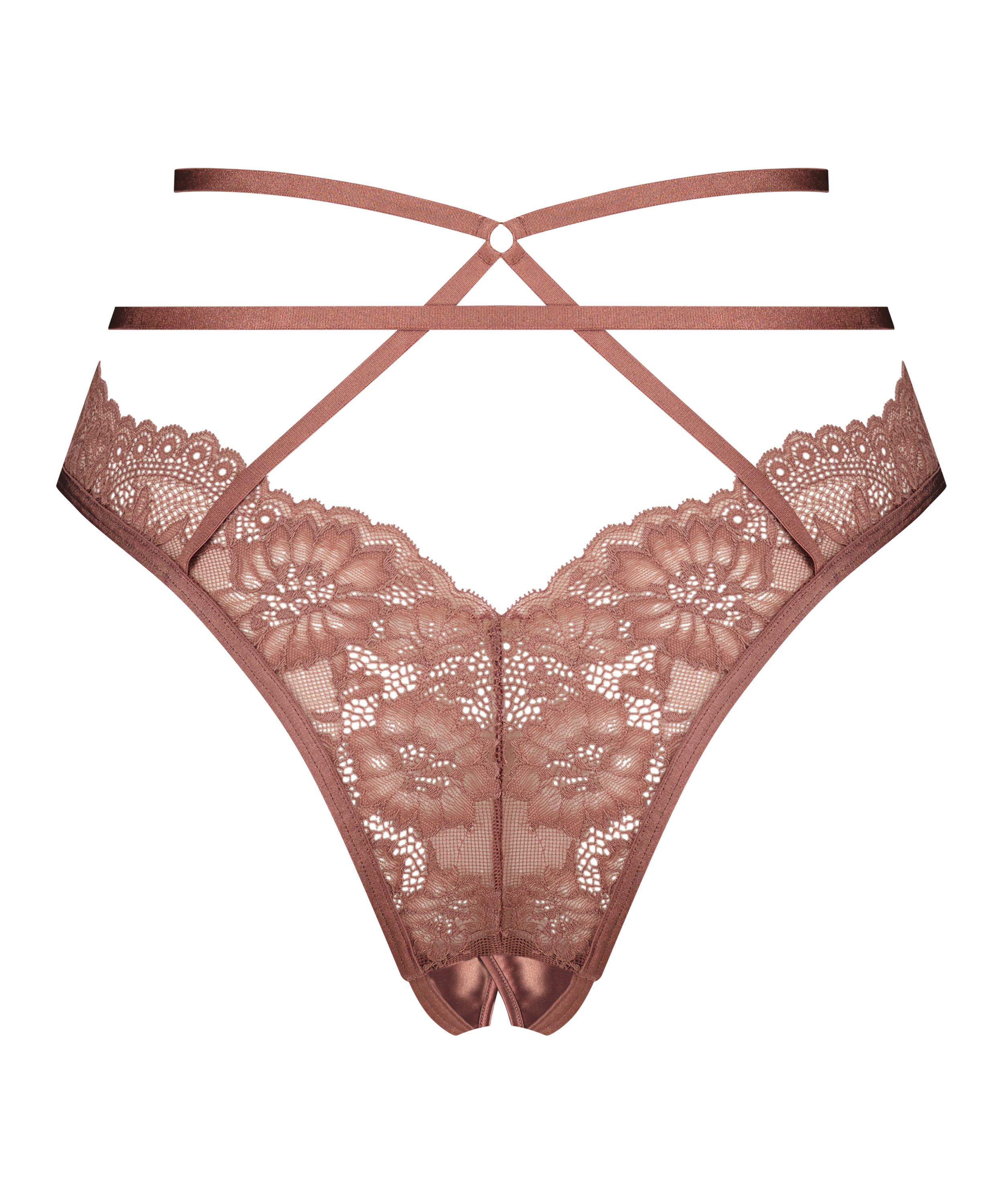 Spice things up with this unique open-crotch brazilian. With an overall lace look in the front and back, with lots of strappy details and cut-outs for the outmost sexiness. The open crotch adds an extra level of spicy. Complete the set with the matching bra!