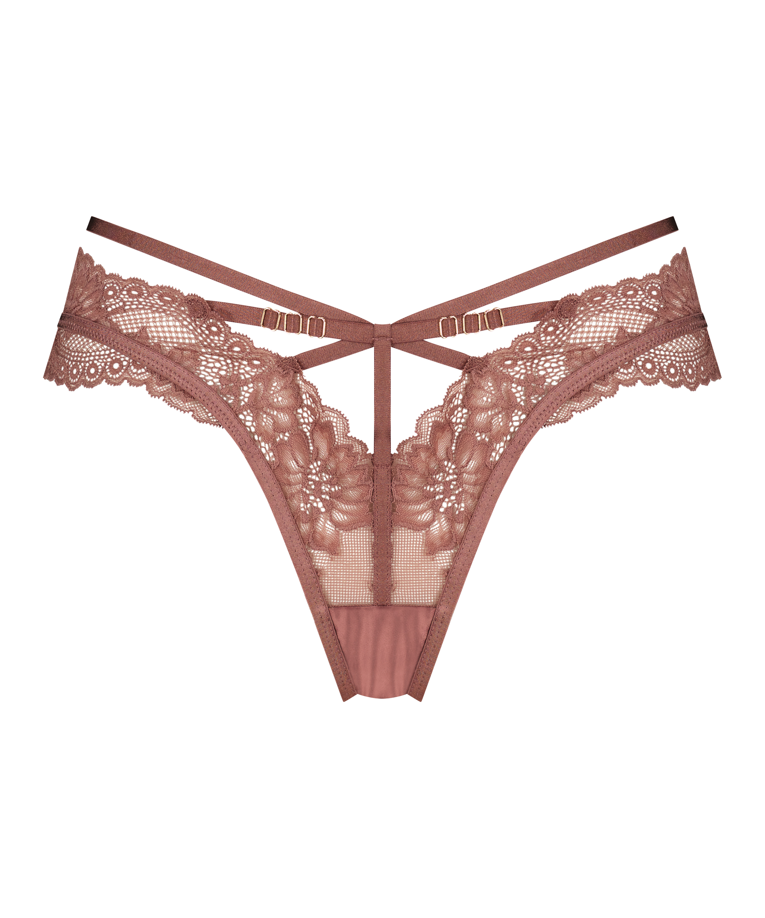Don't miss this sexy thong! With an overall lace look in the front and back, with lots of strappy details and gold hardware. Complete the set with the matching bra!