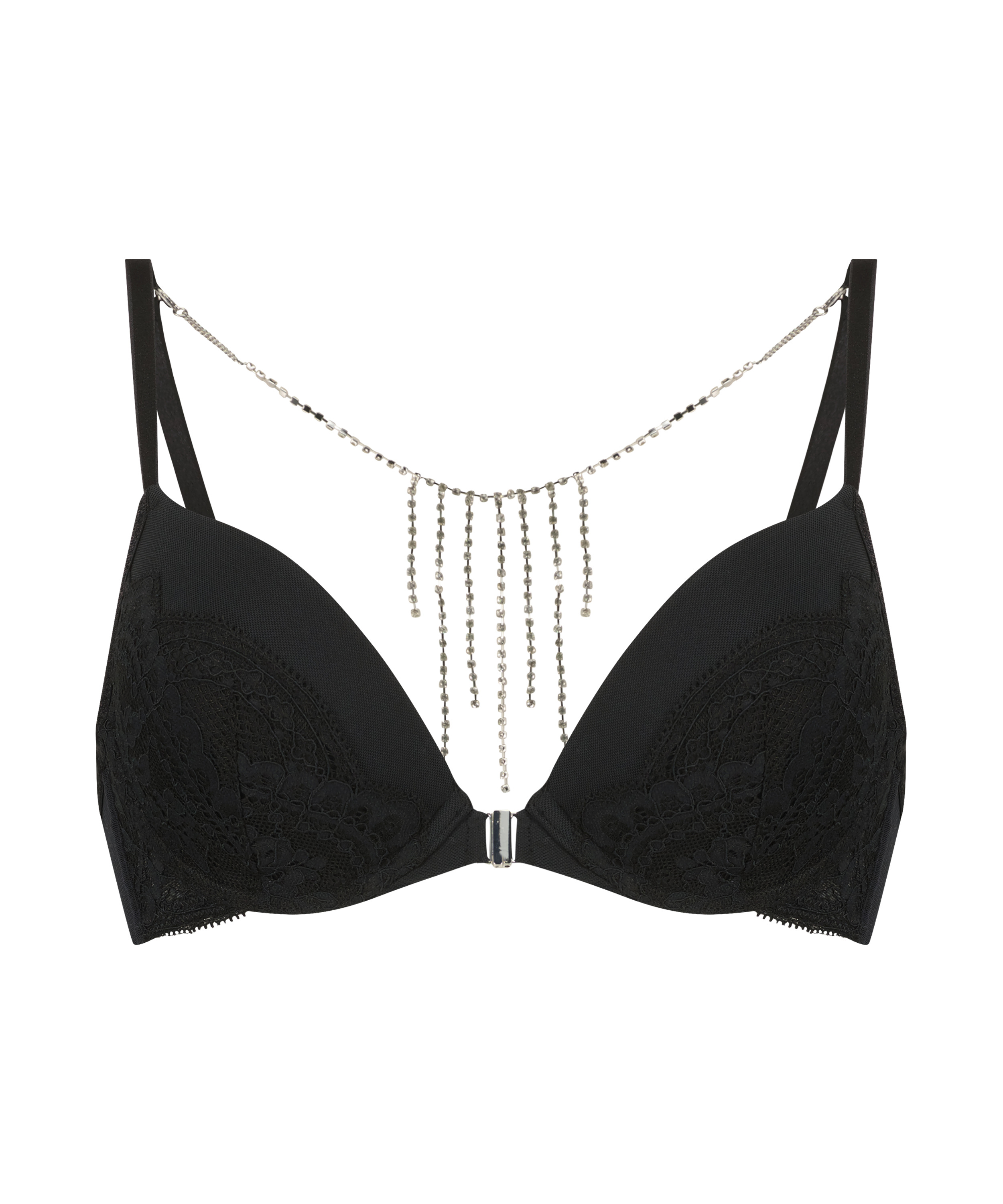 Love this bra! Extremely unique with a rhinestone back necklace, and yes it is removable. With lots of lace and frontal closure for easy wear. I know you can't wait to get your hands on this!