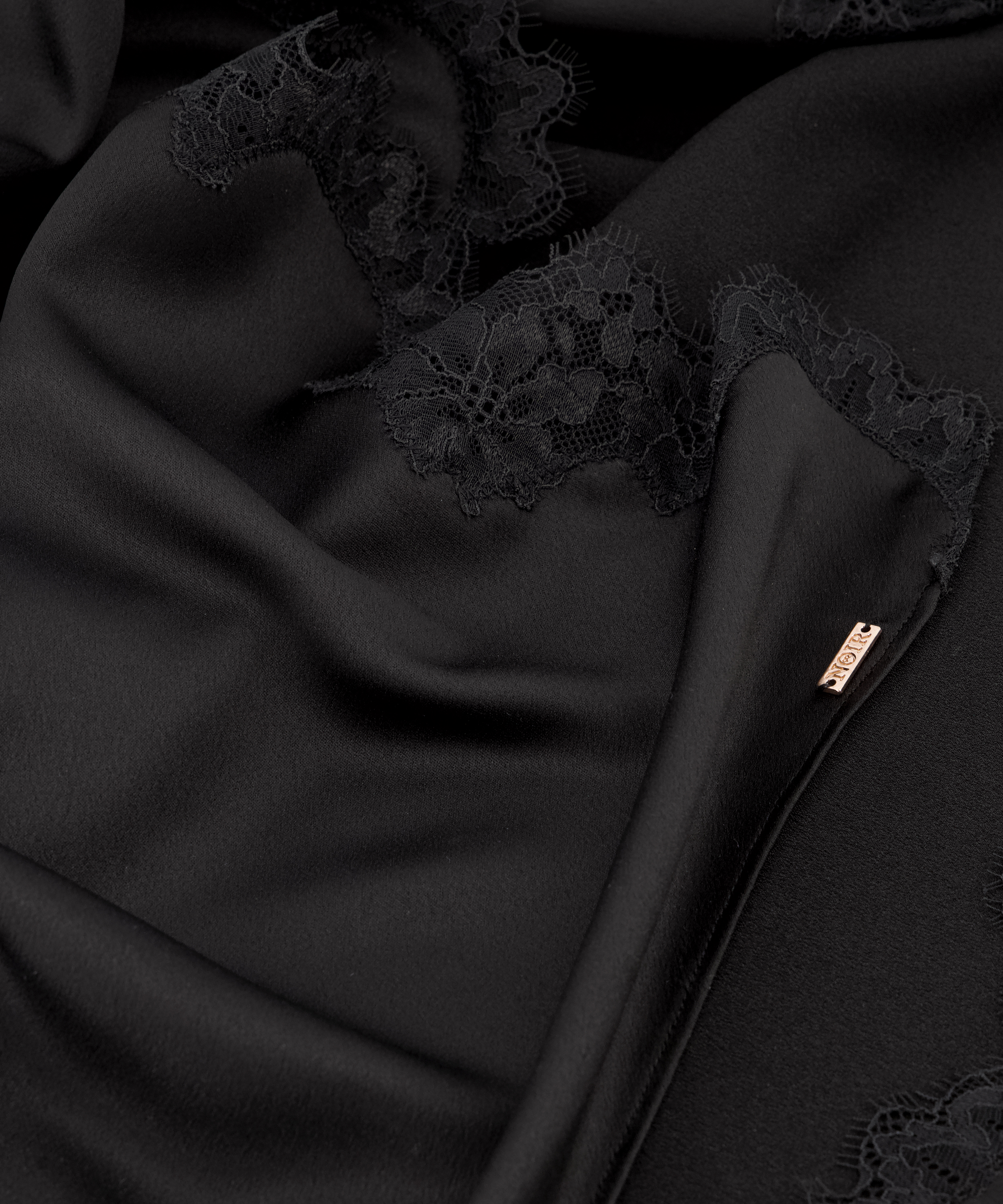 You'll feel super feminine in this beautiful slip dress! The slip dress has a satin look and feel and is finished with lace. The dress is long and comes down to the ankles. The spaghetti shoulder straps are adjustable. Part of our Noir Collection.