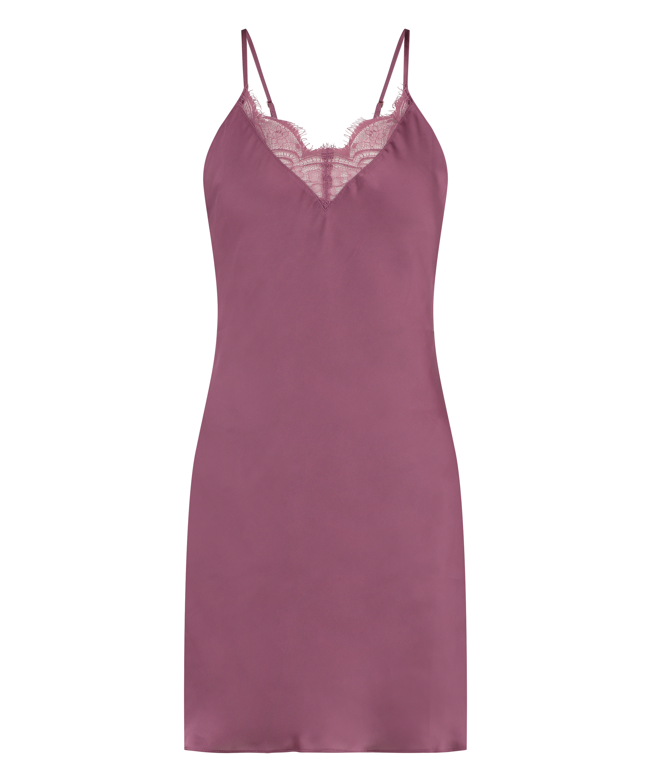 This slip dress is a must-have for your elegant collection! It is made of satin, has a beautiful V-neck and contains beautiful lace details. Combine with a matching kimono for a complete look.