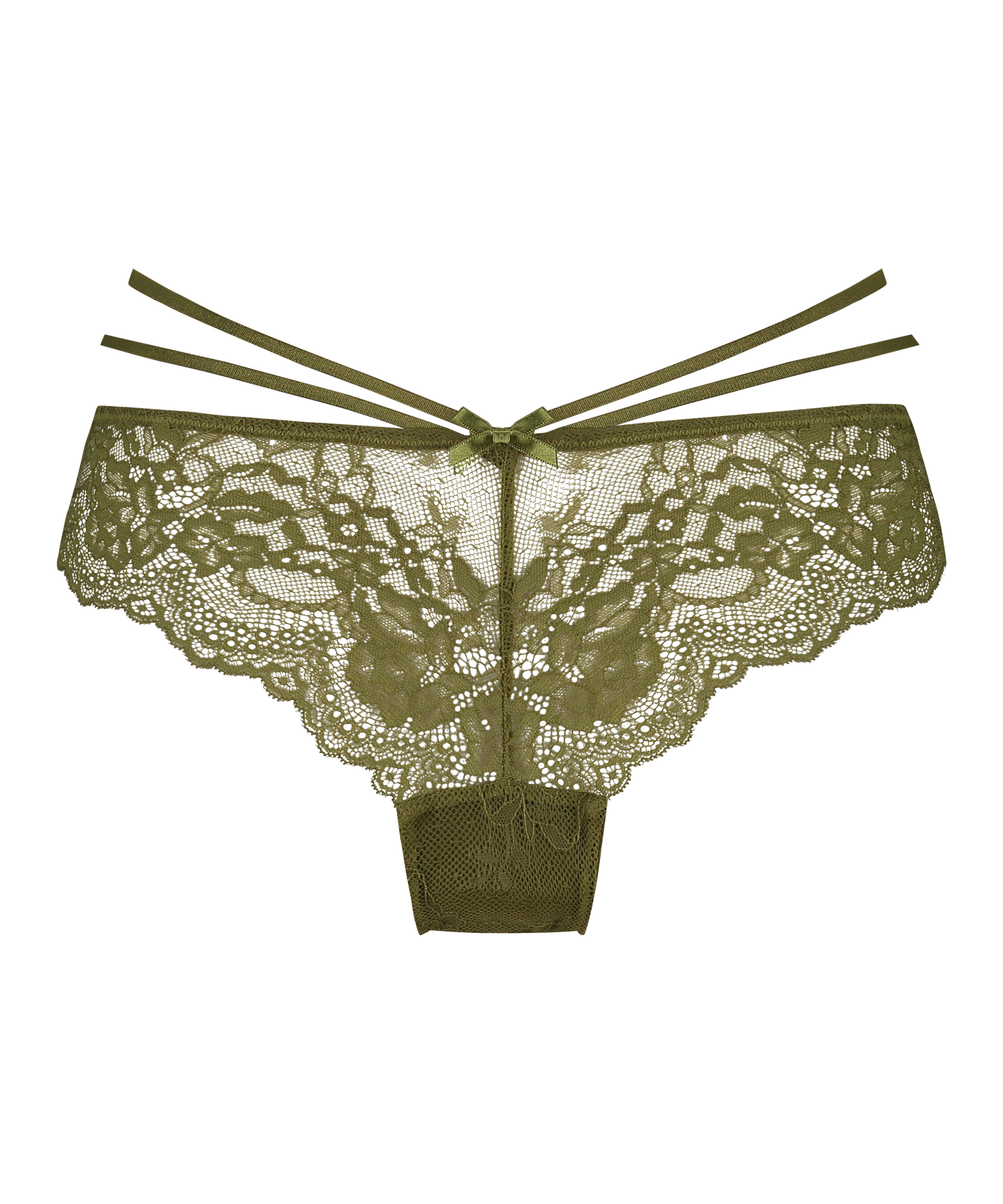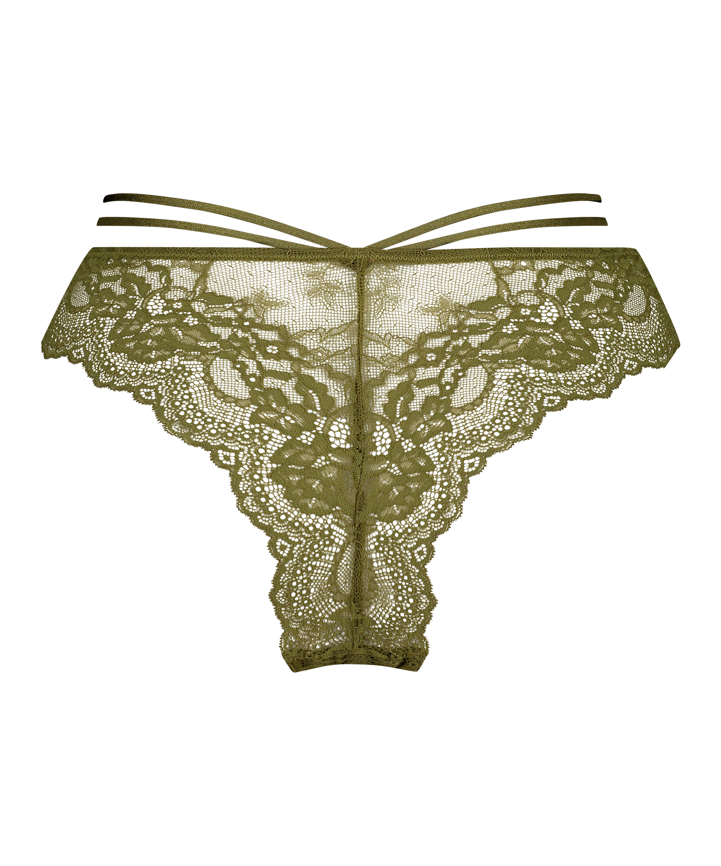 Fall in love with this brazilian! With lots of romantic lace to give a semi-transparent look, along sexy strappy details on the hips. Find a matching bra to complete the set!