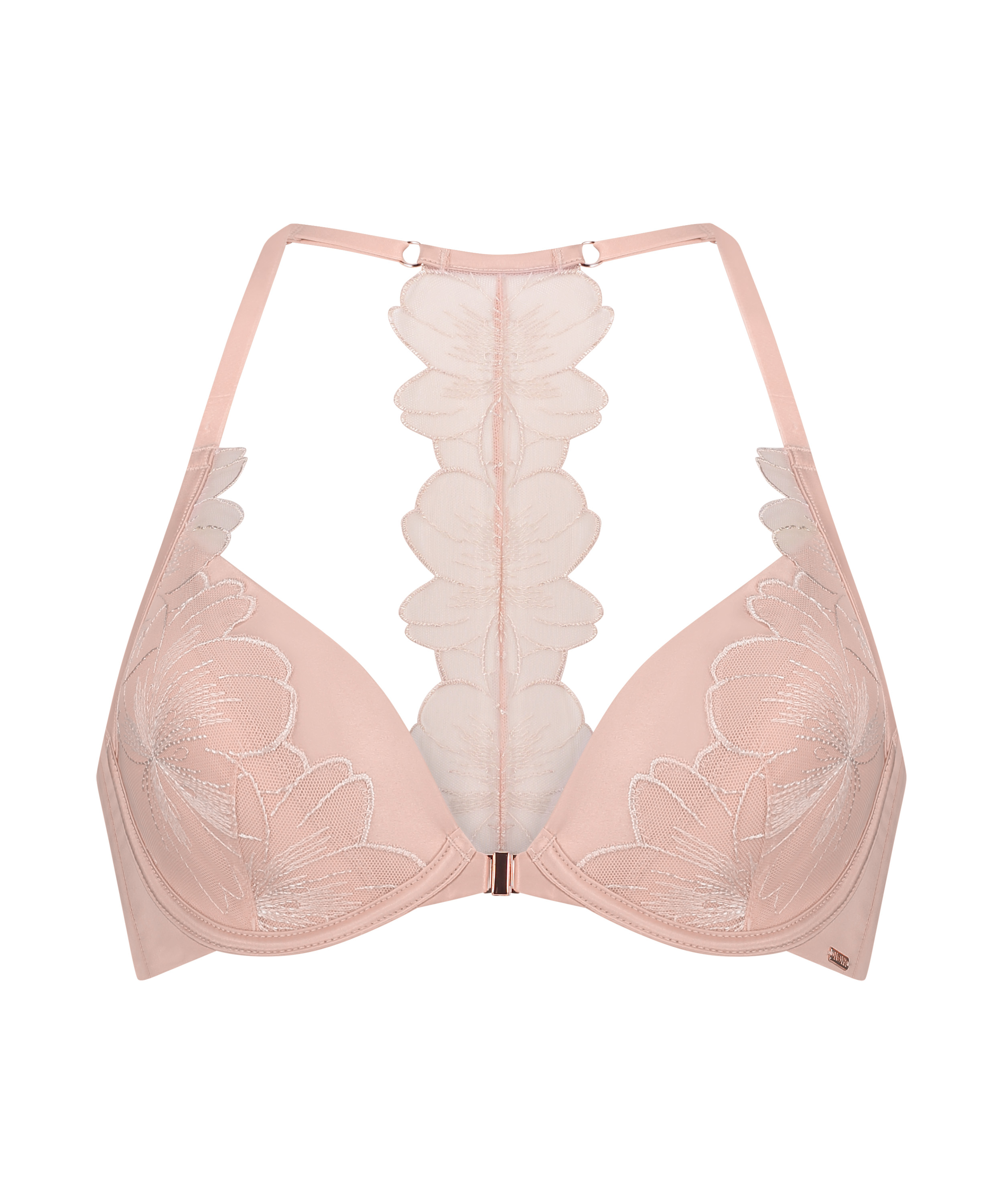 Feel sexy in this stunning bra! This padded bra has a closure clip in the front and the cups are decorated with beautiful embroidered flowers. It has adjustable straps and stunning lace back details. Combine it with the matching knickers to complete the look!